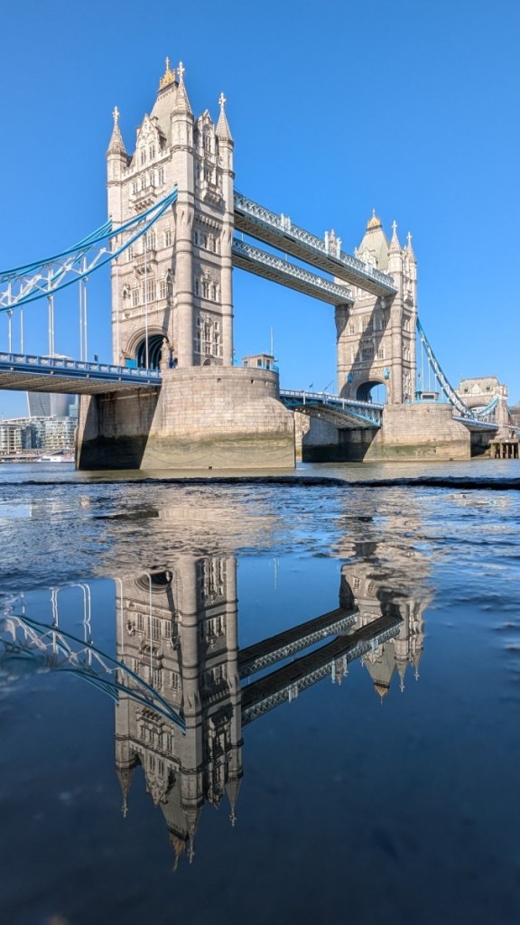 Weil Ebbe war, konnte ich doch tatsächlich die ikonische Brücke bei superkitschigblauem Himmel in einer Pfütze am Rande des Flussbettes spiegeln. Ging allerdings nur mit der Weitwinkelfunktion am Google Pixel 8, dass ich die Brücke ganz drauf hatte. TED LASSO’s alley in Richmond (Paved Court)