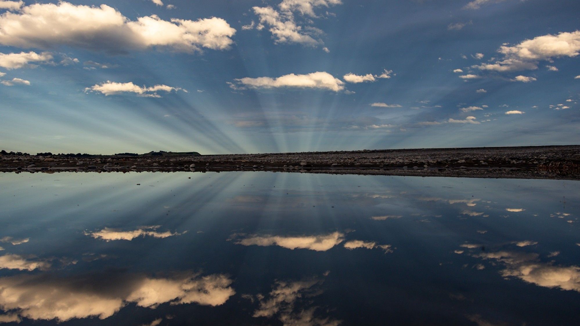 Heute früh (manche würden sagen, gegen Mittag) bin ich dann im Regen losgefahren, der sich aber bald gelegt hat. Ich bin durch sehr viele unterschiedliche Landschaften gefahren. Aber der Höhepunkt kam dann erst kurz vor Kaikōura. Da sah ich vom Auto aus über dem Meer Gegendämmerungsstrahlen (ohne zu diesem Zeitpunkt den genauen Begriff für das Phänomen gekannt zu haben) und konnte zum Glück auf einem Rastplatz mit Zugang zum Strand anhalten. Was ich in der nächsten halben Stunde oder so am Himmel sehen konnte, war atemberaubend. So viele Wolken in verschiedenen Formen, mal dramatisch, mal locker-flockig – und dazu entweder das rauschende Meer, oder: zwei große Pfützen am Strand, in denen ich eben auch die Gegendämmerungsstrahlen (auf Englisch anticrepuscular rays) spiegeln konnte: