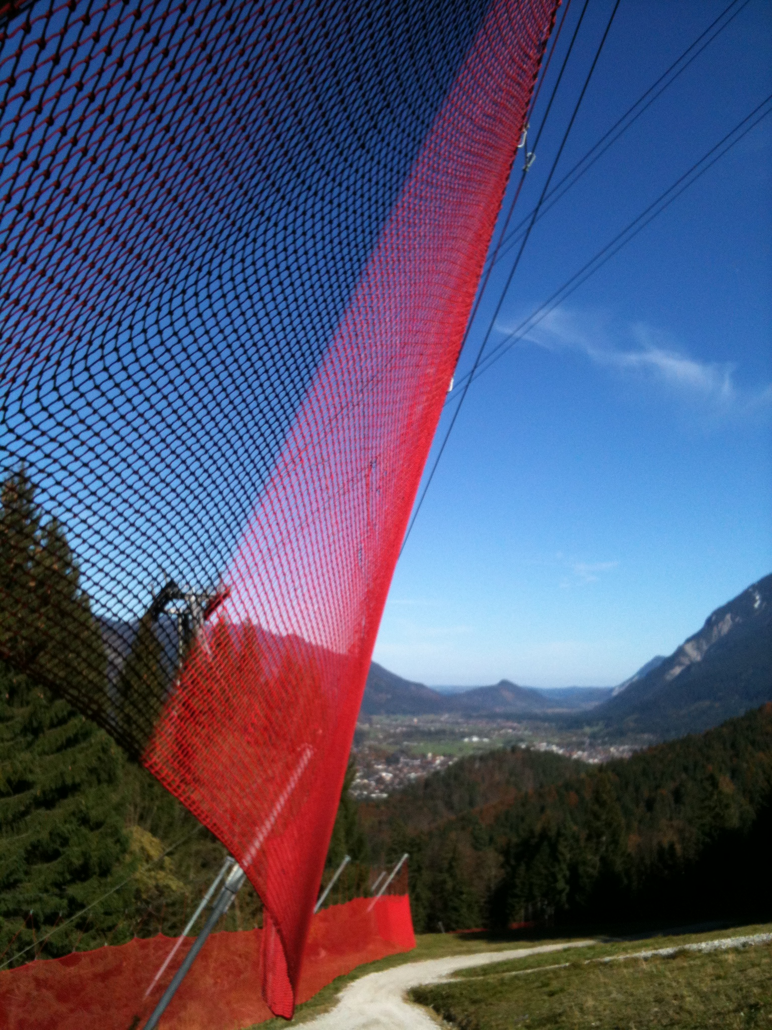 Beim Aufstieg – über die Skipiste. Da es eine spontane Entscheidung war, wandern zu gehen, während mein Freund Gleitschirm flog, hatte ich leider wieder nur mein iPhone3Gs dabei – dieses Foto ist nicht ganz scharf, aber ich mag das Rot des Netzes.