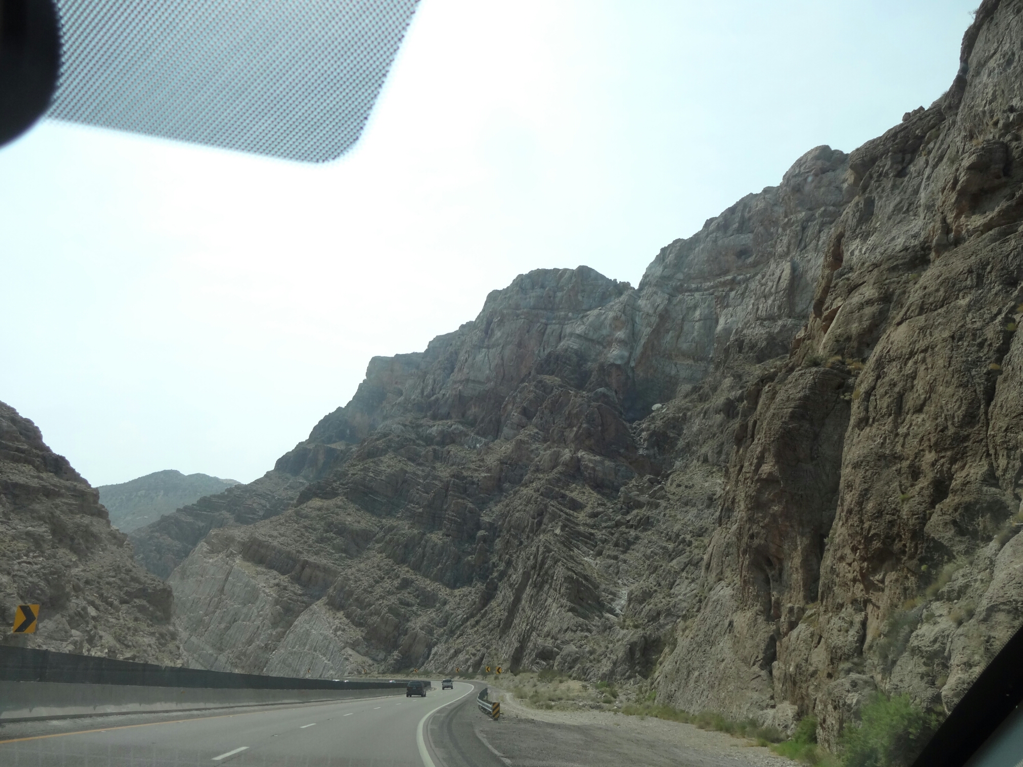 Da unser Plan für heute (Anreise zum Zion National Park und erster „Drive-thru“ mit Halt an den Scenic Points, um leichter entscheiden zu können, welche kurze Wanderung wir morgen früh ab 8 machen wollen) nicht geklappt hat, weil zum einen alle Parkplätze im N.P. belegt waren und zum anderen die Scenic Road nur per Shuttle zu befahren ist, gibt es heute nur ein Bild von der Fahrt von Vegas nach Hurricane, Utah, geschossen von meiner Nichte. Leider war entweder die Linse ihrer Kamera oder/und die Fensterscheibe nicht ganz sauber, sodass die meisten Bilder dunkle Flecken haben. Dieses hier nur ganz leicht: