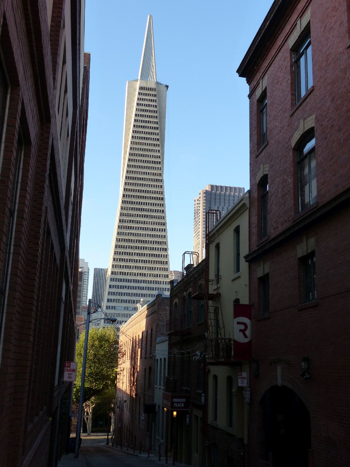 Unser Hotel lag im Bezirk North Beach, an der Kreuzung von Broadway und Columbus Ave, gerade noch so im italienischen Viertel (eine Straße weiter südlich war man gleich in Chinatown), mit Blick auf eins der Wahrzeichen von S. F., der Transamerica Pyramid.
