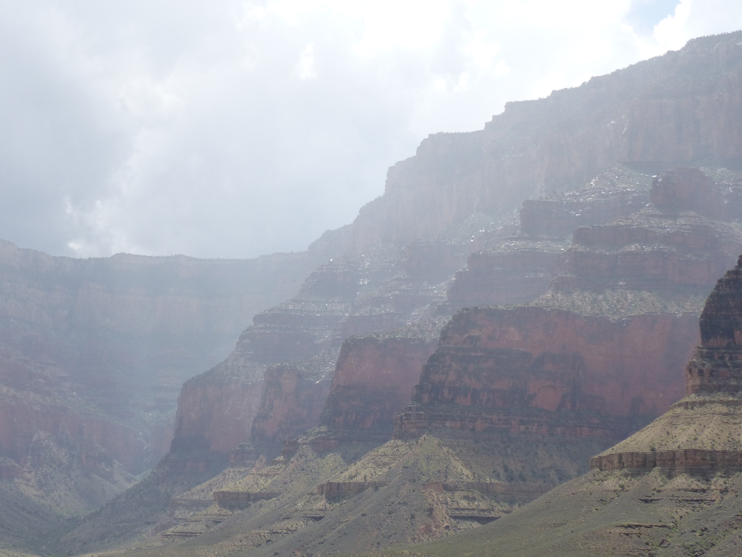 Nach dieser Rast kam dann der gefährlichste Teil unserer Wanderung. Es fing wieder zu regnen an und bald hörten wir auch wieder Donnergrollen. Die jungen Leute waren wieder ein ganzes Stück vor mir, als plötzlich da ein helles Flackern war mit einem sofortigen Donnerknall im Anschluss. Da ist mir das Herz ganz schön in die Hose gerutscht! Meine Nichte ist dann auch – wie vom Donner gerührt (endlich verstehe ich diese Redewendung) – stehen geblieben und hat auf mich gewartet. Von nun an blieben wir eng beieinander. Wir hatten keinerlei Möglichkeit, uns irgendwie zu schützen – so blieb uns nichts anderes übrig als weiterzugehen und zu hoffen, dass der Ranger recht hatte, der einem anderen Wanderer erzählt hatte, dass Gewitter nicht so gefährlich sind im Grand Canyon, weil die Felsen Eisen enthielten und deswegen der Blitz in die Felsen, und nicht in Menschen, schlagen würde. Kurz darauf folgte ein weiterer Blitz und Donner – wieder so nah und so laut, dass mir Angst und Bange war. Nun erfuhren wir am eigenen Leib, wie sehr die Hormone, die bei Angst ausgeschüttet werden, einen „beflügeln‟ können. Plötzlich spürte ich kaum mehr Anstrengung, obwohl es permanent bergauf ging. Ich setzte einfach einen Fuß vor den anderen – und so erreichten wir safe and sound den letzten Unterstand. Dort trafen wir auch diejenigen wieder, die vor uns gewandert waren. Wir brachen dann alle gemeinsam auf – allerdings zog sich „das Feld‟ dann wieder relativ schnell auseinander, weil die anderen einfach schneller waren. Auf dieser letzten Etappe regnete es kaum mehr und hörte dann auch auf. Die Angst war weg, dafür hatte ich Ablenkung durch das Gespräch mit einem Brasilianer, der auch längere Zeit in Deutschland gelebt hatte, und mit dem ich mich die ganze Strecke bis zum Rim unterhalten habe.