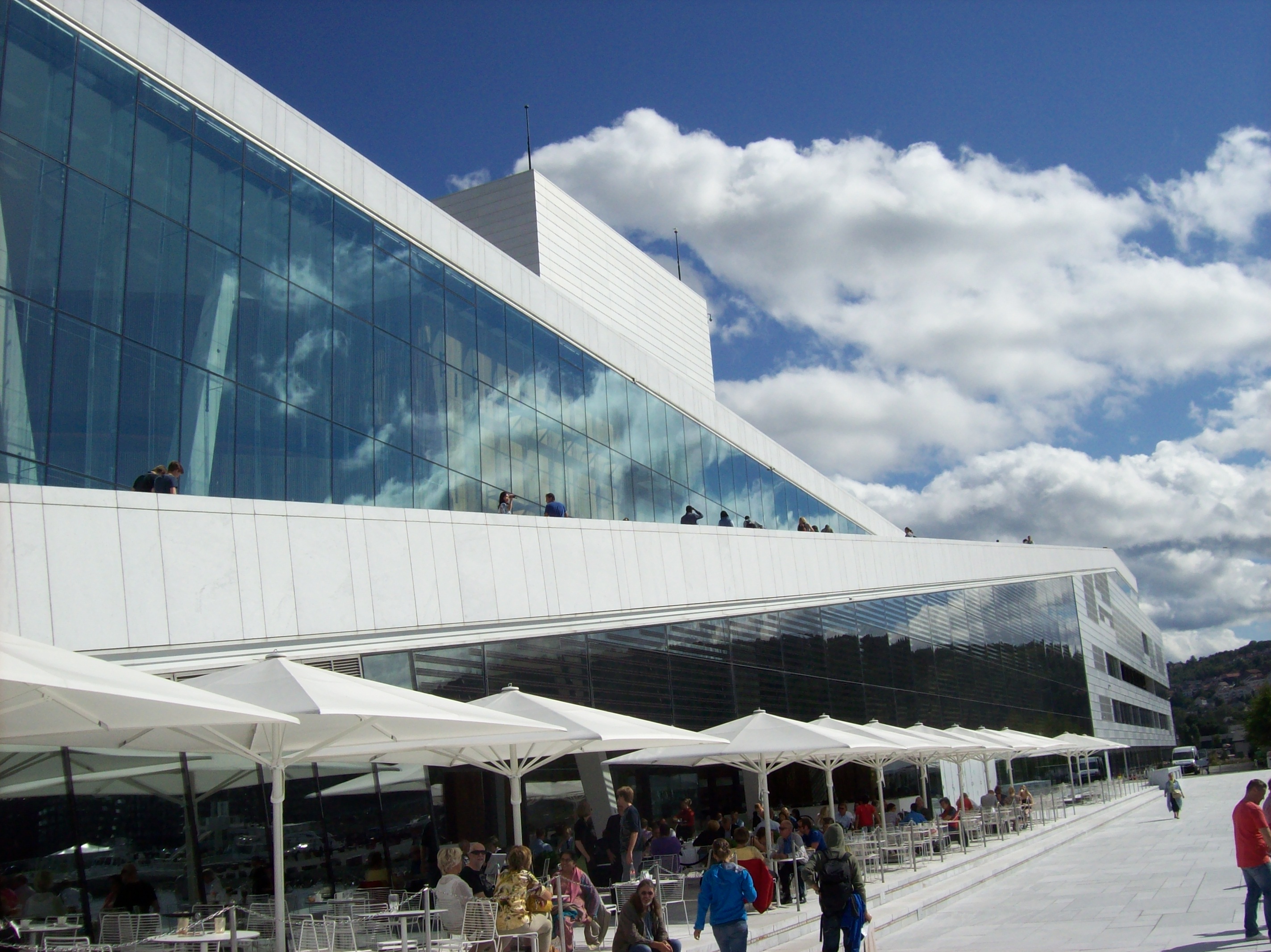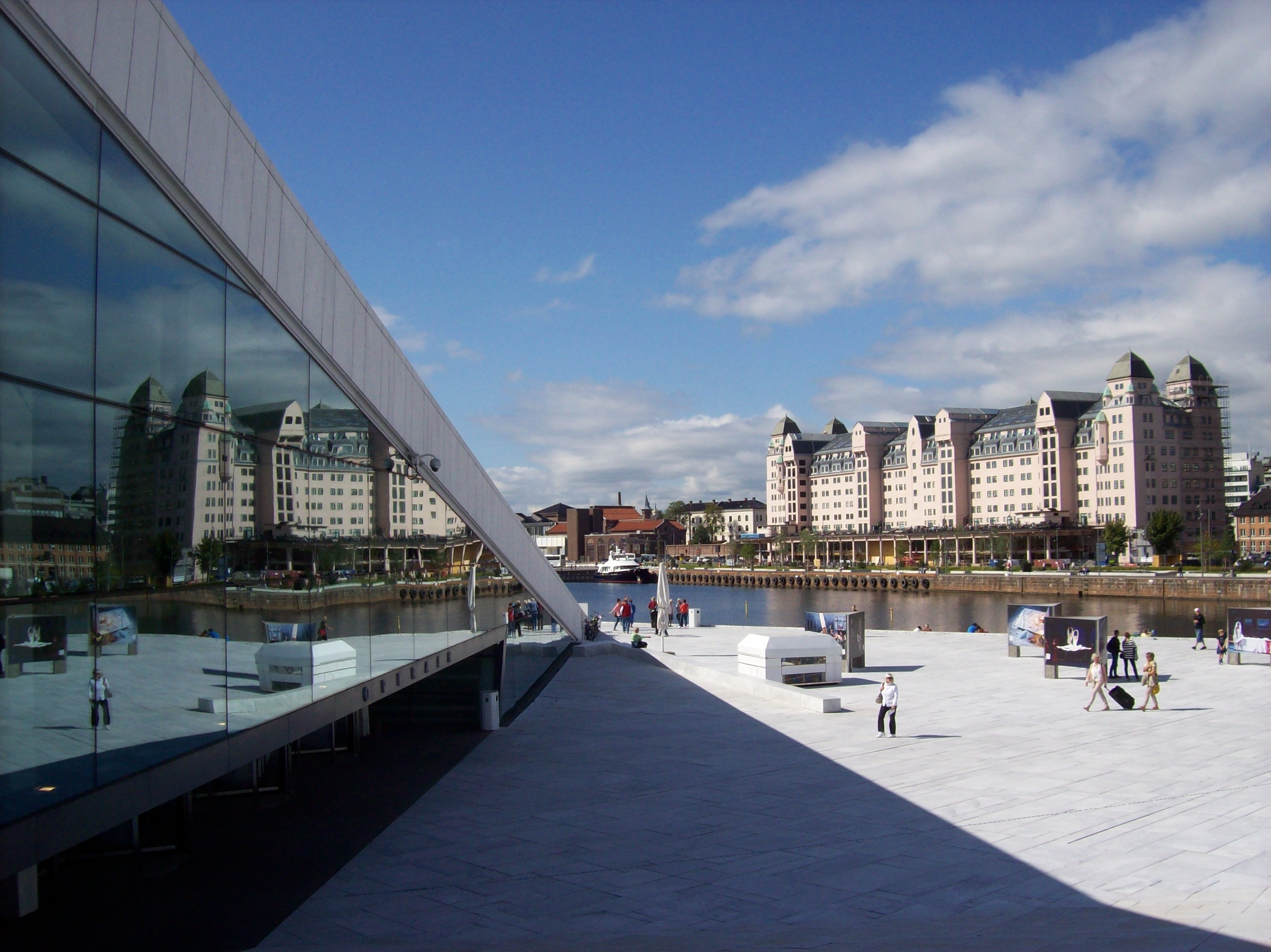 Und so geht es heute mit dem 2008 fertig gestellten Opernhaus (entwickelt von Snøhetta Arkitektur og Landskap, Projektleiter Tarald Lundevall) in Oslo los, das es mir so richtig angetan hat. Leider habe ich die Oper noch nicht in Action gesehen – irgendwann muss ich mir da auch mal eine Oper oder eine Ballettaufführung ansehen, wenn ich meine Freundin, die in der Nähe von Oslo lebt, besuche. Aber alleine das Gebäude und wie es sich in das Stadtbild einfügt, ja es im wahrsten Sinne des Wortes spiegelt, finde ich unglaublich faszinierend. Und das zeigen sogar die Fotos meiner alten Mini-Digitalkamera, die ich bei meiner letzten Oslo-Reise 2013 geschossen habe.