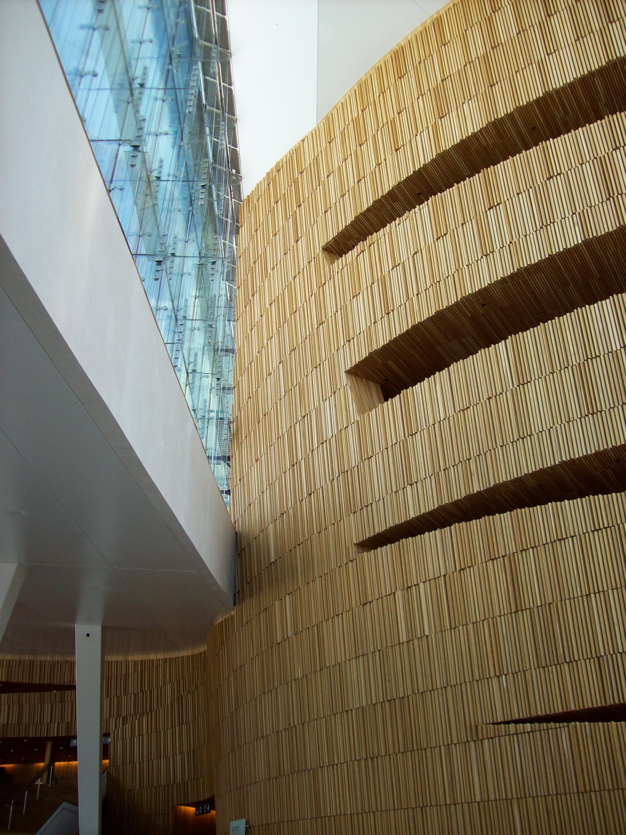Es gibt, denke ich mal, auch akustische Gründe, warum zumindest der Konzertsaal mit Holz ausgekleidet ist. Klar, der Teil, den man auf meinen Bildern sieht, müsste deswegen nicht unbedingt aus Holz sein. Ich mag den Materialmix aber in diesem Fall, auch den Kontrast von geraden Linien und runden Formen.