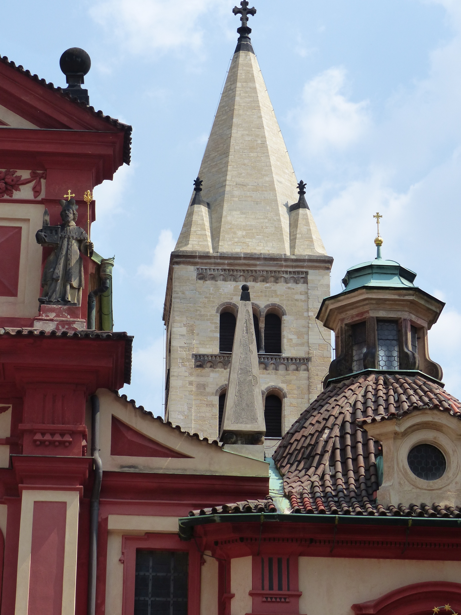 Da ich schon das vierte Mal in Prag war, ging es mir beim Fotografieren weniger darum, möglichst alle Sehenswürdigkeiten einzufangen, es gibt z. B. kein Bild von der astronomischen Uhr am Altstädter Ring oder vom Hus-Denkmal (an der Karlsbrücke und am Veitsdom bin ich allerdings nicht vorbeigekommen…), dafür z. B. von Bauarbeitern, die mitten auf der Straße an den Straßenbahnschienen Schweißarbeiten erledigen, oder gelben Pinguinen. 😉 Erstmalig habe ich mir auch eine Lizenz zum Fotografieren auf dem jüdischen Friedhof gegönnt – bei früheren Besuchen war ich immer zu geizig. Zunächst aber ein paar Aufnahmen von Türmen und Dächern.