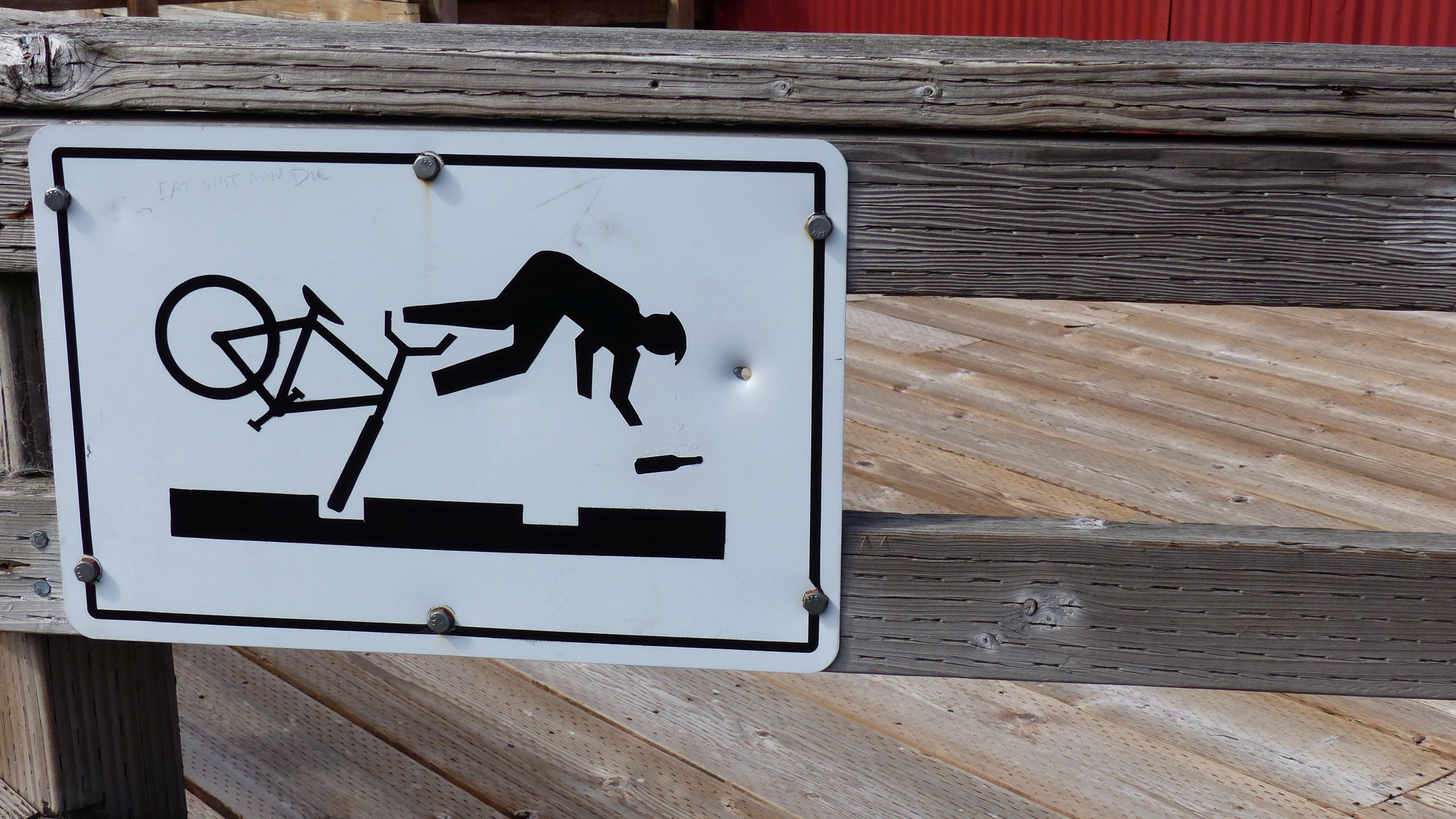 Die Astoria Riverfront Trolley fährt – wie der Name schon sagt – entlang des Flusses. Ich hatte allerdings direkt Glück, dass ich überhaupt eine zu Gesicht bekam, denn wie heißt es so schön auf Wikipedia: „The car makes a trip approximately once an hour in each direction, but there is no exact schedule.“ Dafür, dass das einmal DIE Touristenattraktion in Astoria war, ist einmal pro Stunde schon arg spärlich. Ich bin auf jeden Fall nicht damit gefahren. Auch nicht mit dem Fahrrad – was vielleicht angesichts dieses Warnschildes auch ganz gut war! 😀 Obwohl ich eh keine Bierflasche in den Hand hielt… 😉 Ach, ich liebe dieses Schild einfach!