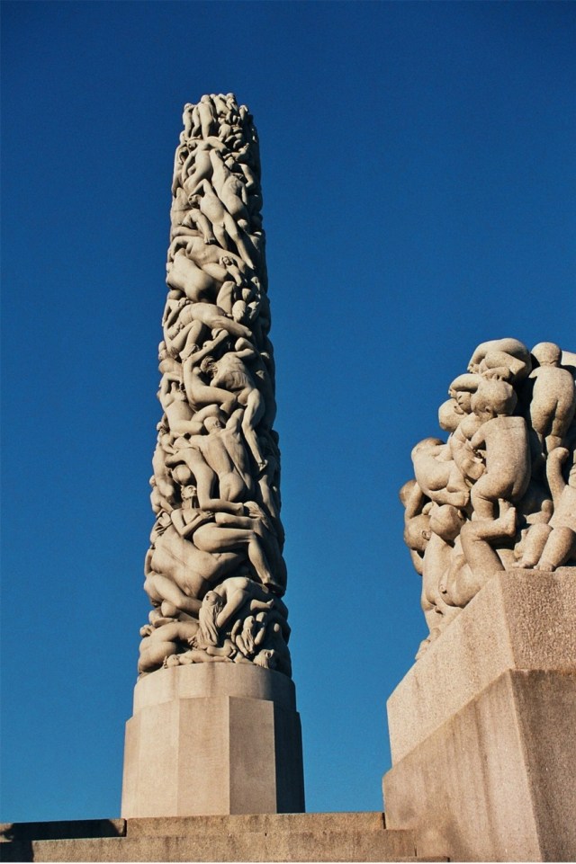 Dann begann also der Film und man sah Ausschnitte von Steinskulpturen, die doch verdächtig nach Vigeland-Skulpturen aussahen. Ich dachte mir noch so: Naja, vielleicht gibt es auch in Schweden Skulpturen von Gustav Vigeland. Dann aber folgte eine Aufnahme, auf der man eine komplette Skulptur sah (eine andere, als die auf dem Foto unten), und da wusste ich: Das IST der Vigelandsparken in Oslo!