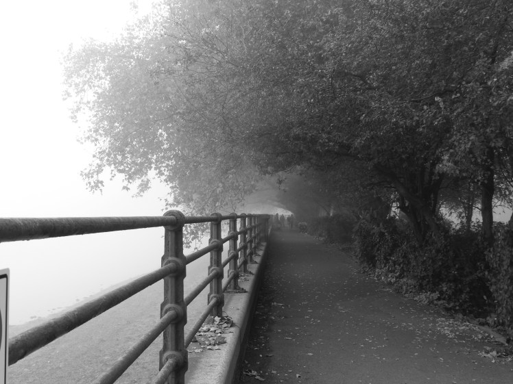 Heute morgen war’s neblig in München – das ließ doch Erinnerungen an Herbst 2015 in London aufkommen. Rechts im Bild: der Bishops Park in Fulham. Links im Bild: die Themse.