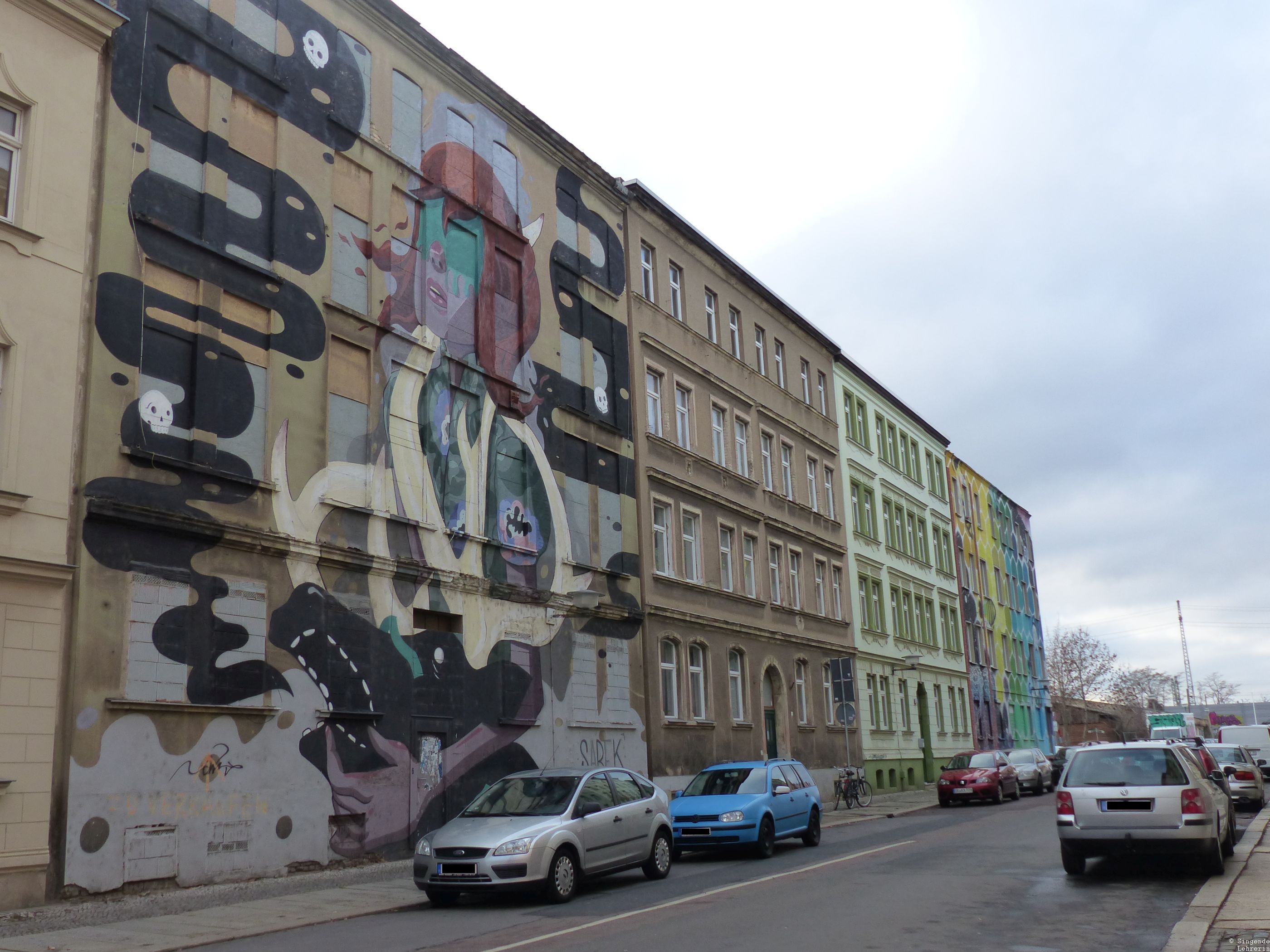 In Teil 1 werde ich euch großflächige Gemälde auf ganzen Häuserwänden präsentieren und dann in Teil 2 noch ein paar Graffiti und sonstiges vom Straßenrand mit euch teilen. Die meisten dieser Gemälde sind übrigens wohl im Rahmen des All You Can Paint Festivals 2012 der Freiraumgalerie Halle (S) entstanden. Bei einigen Werken konnte ich den/die Künstler*in herausfinden, bei manchen leider nicht.