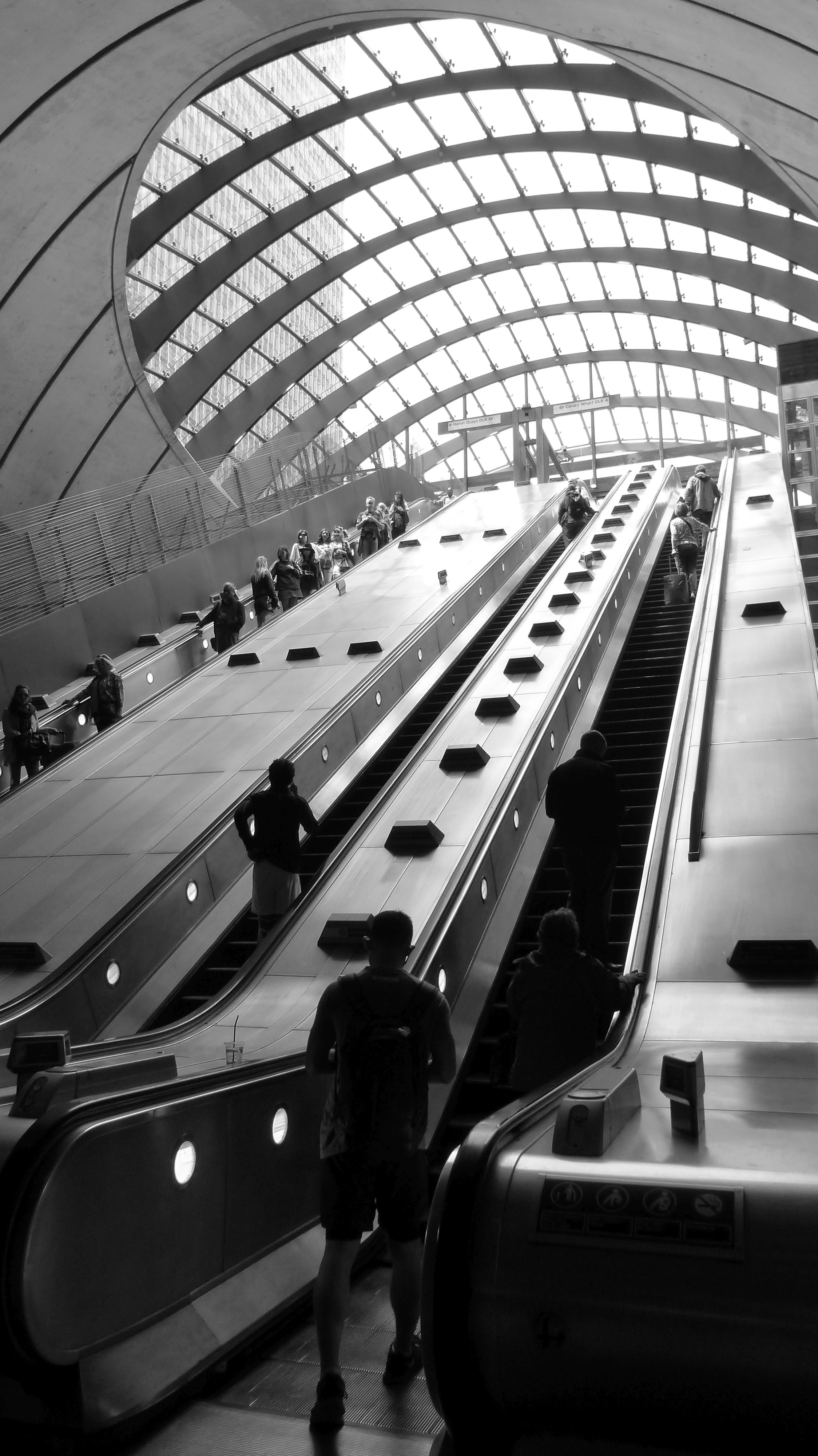 Da die letzten beiden Mit-dem-Fotoapparat-unterwegs-Beiträge (#35 + #36) ziemlich bunt waren, gibt es heute ein Bild in schwarz-weiß. Da ich gedanklich schon wieder auf zwei London-Trips bin – Anfang Januar alleine und Anfang März mit Adoring Audience zu Tom Hiddleston (sicher) und Benedict Cumberbatch (hoffentlich tritt er bei Letters Live am 7. März auf!) – ein Bild aus dem Londoner U-Bahn-Netz (Canary Wharf Station).