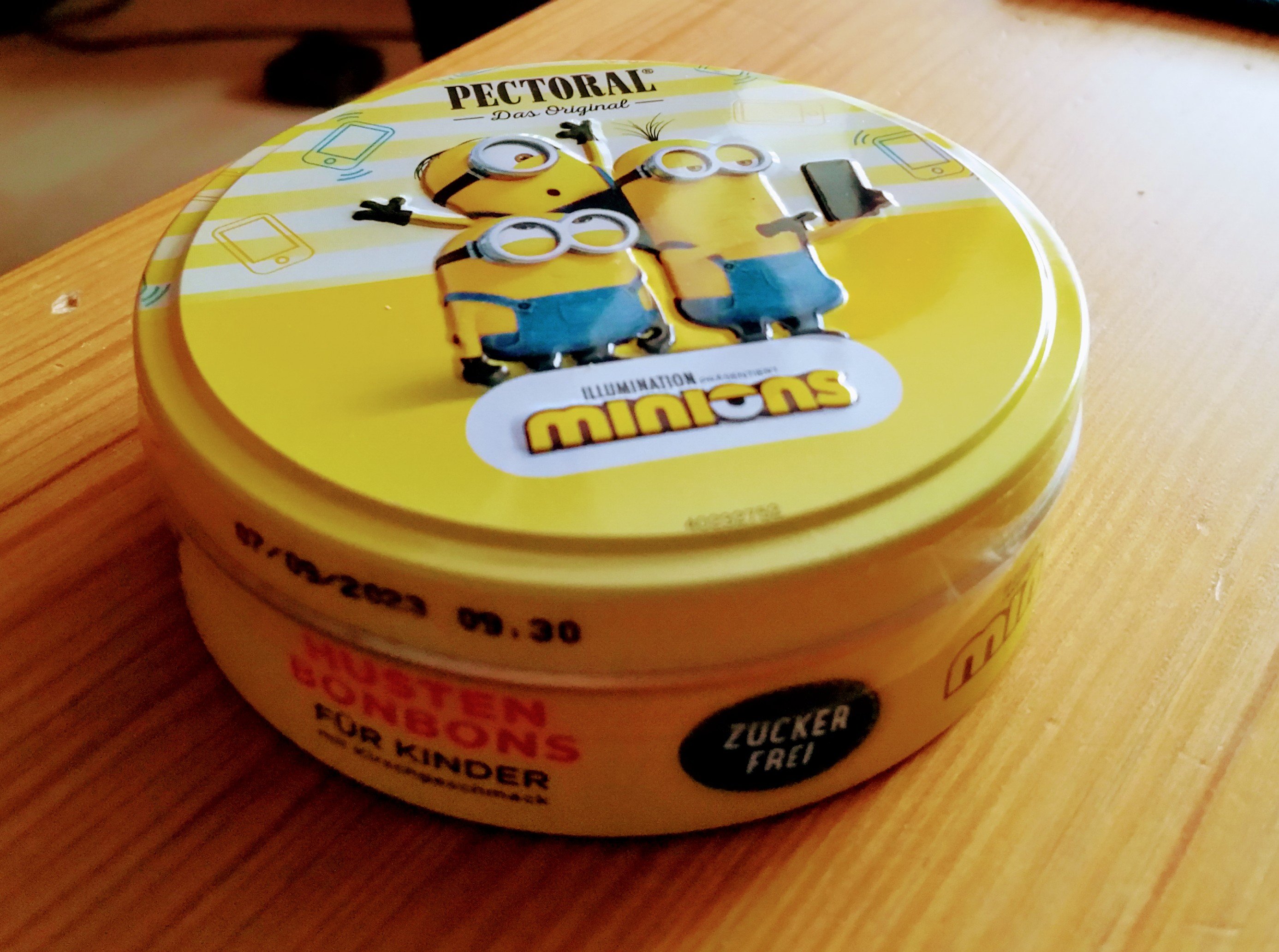 Mir ist nach etwas Leichtigkeit, denn Schwere gibt es z. Zt. genügend… Aber wofür steht diese Dose mit Hustenbonbons? Bei meiner Apotheke habe ich die aus einem Korb gefischt, der sich klar an Kinder gerichtet hat. Mein Kommentar zur Apothekerin beim Zahlen: „Ich habe übrigens keine Kinder!“ 😉 Und im Nachsatz: „Und Husten habe ich auch nicht… “ 😀