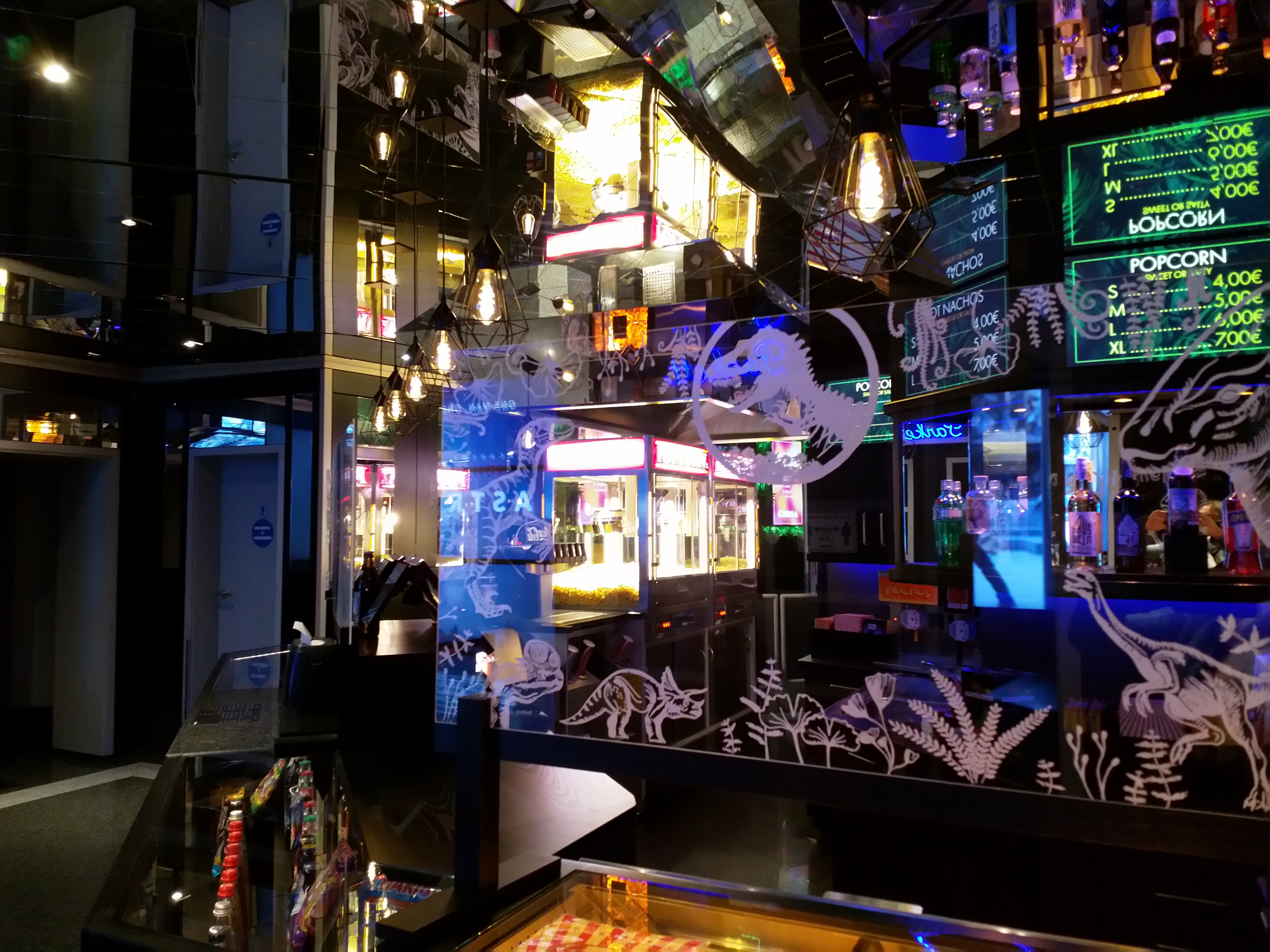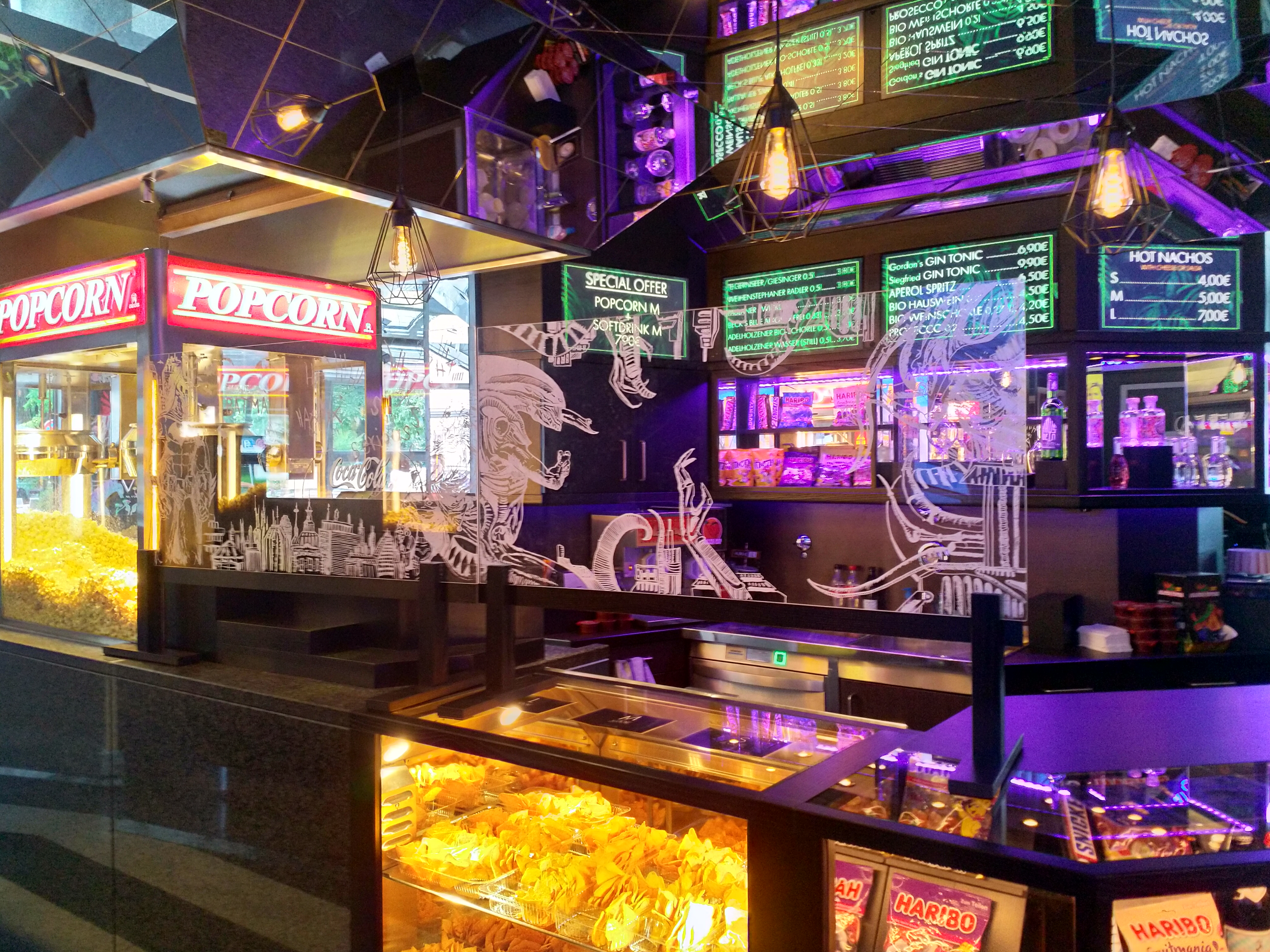 Das Innere des winzigen Foyers wurde vor ein paar Jahren renoviert und mit Projektionswänden und Spiegeln an der Decke ausgestattet. Im Zuge der Corona-Pandemie wurden an den Theken zusätzlich Gläser eingesetzt, verziert mit allerlei Motiven aus Filmen.