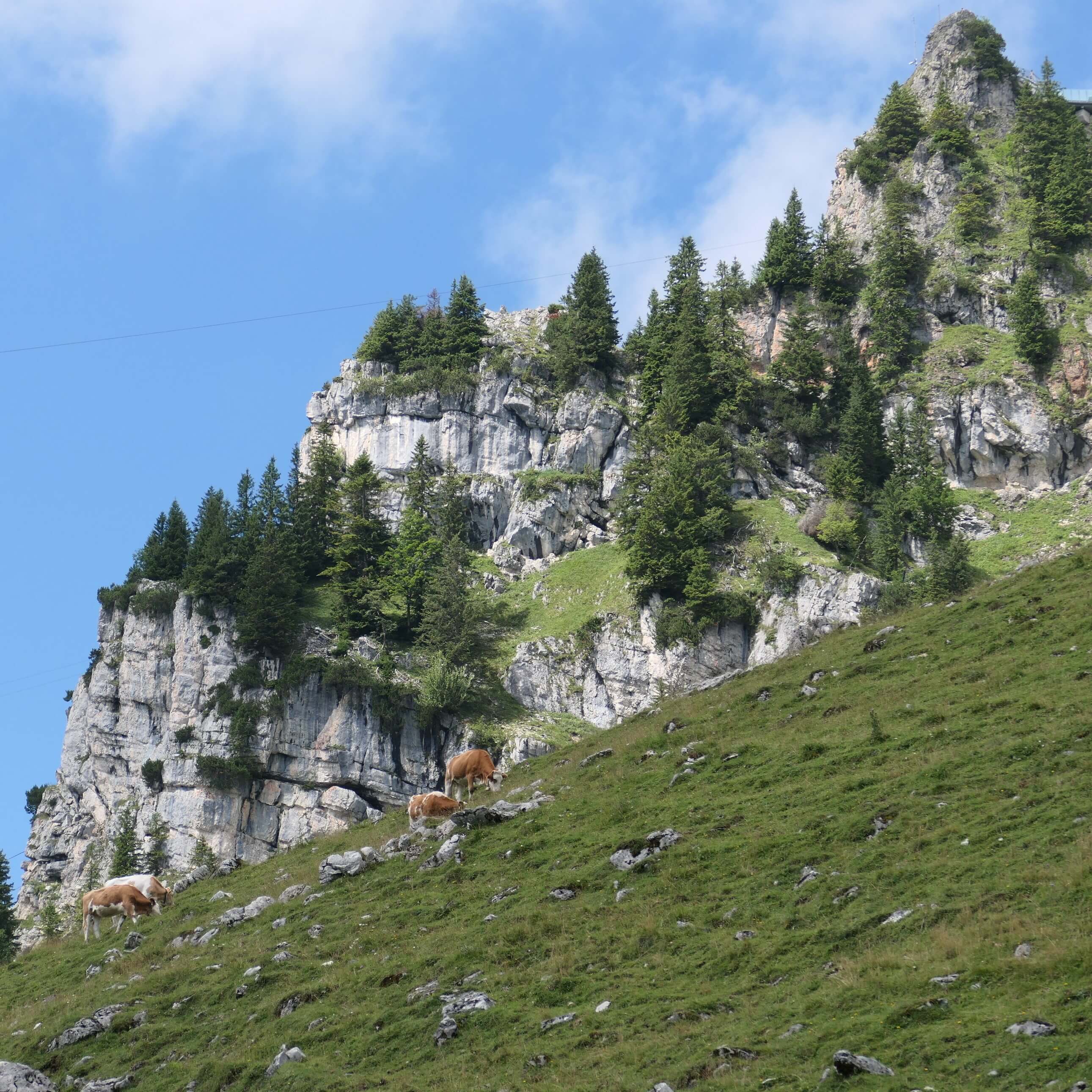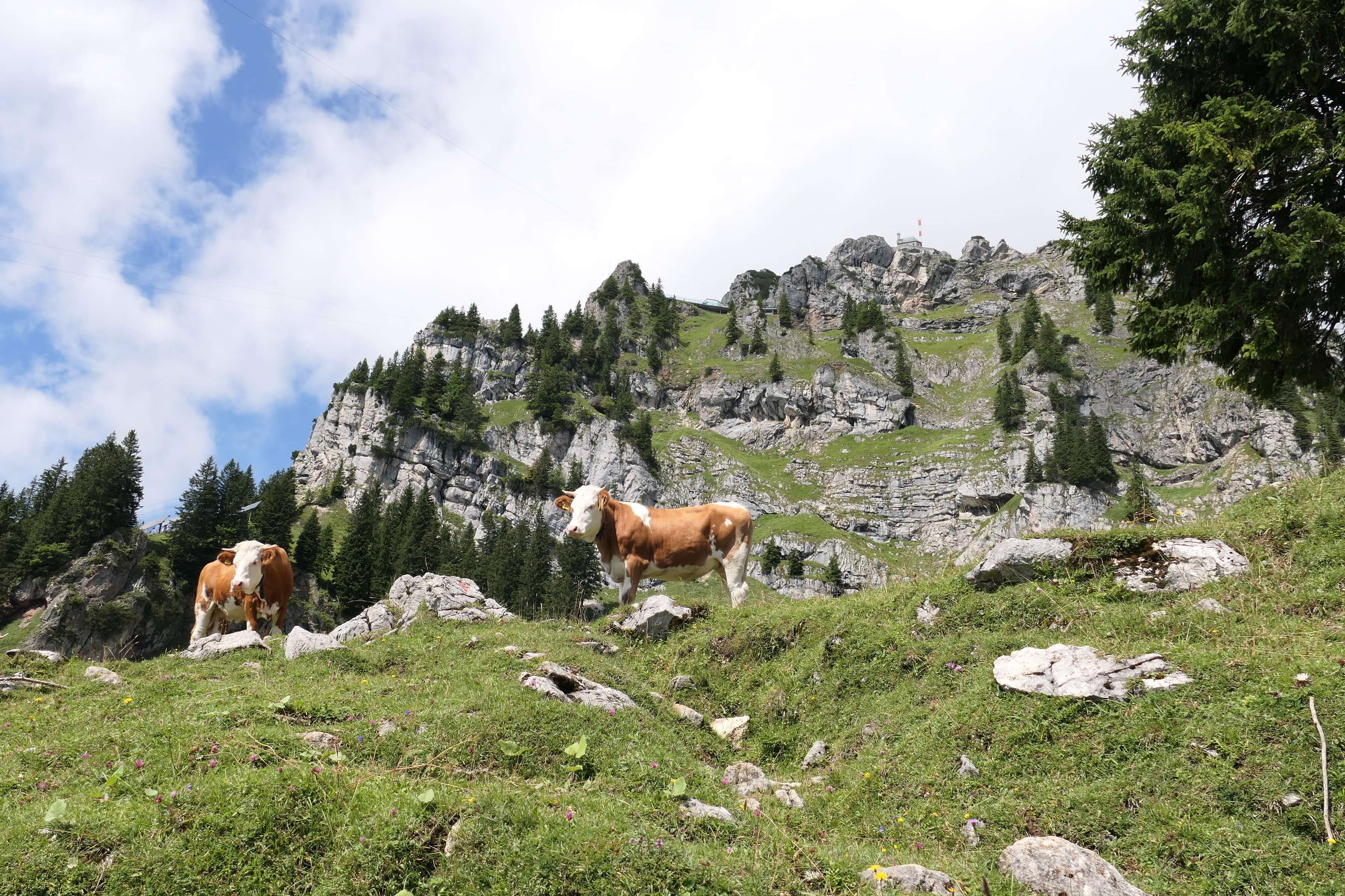 Auf ging es dann zum letzten Abschnitt – die Steilwand schon in Sichtweite. Die beiden Kühe auf dem rechten Bild wachten über den Pfad, der genau zwischen ihnen durchführte.