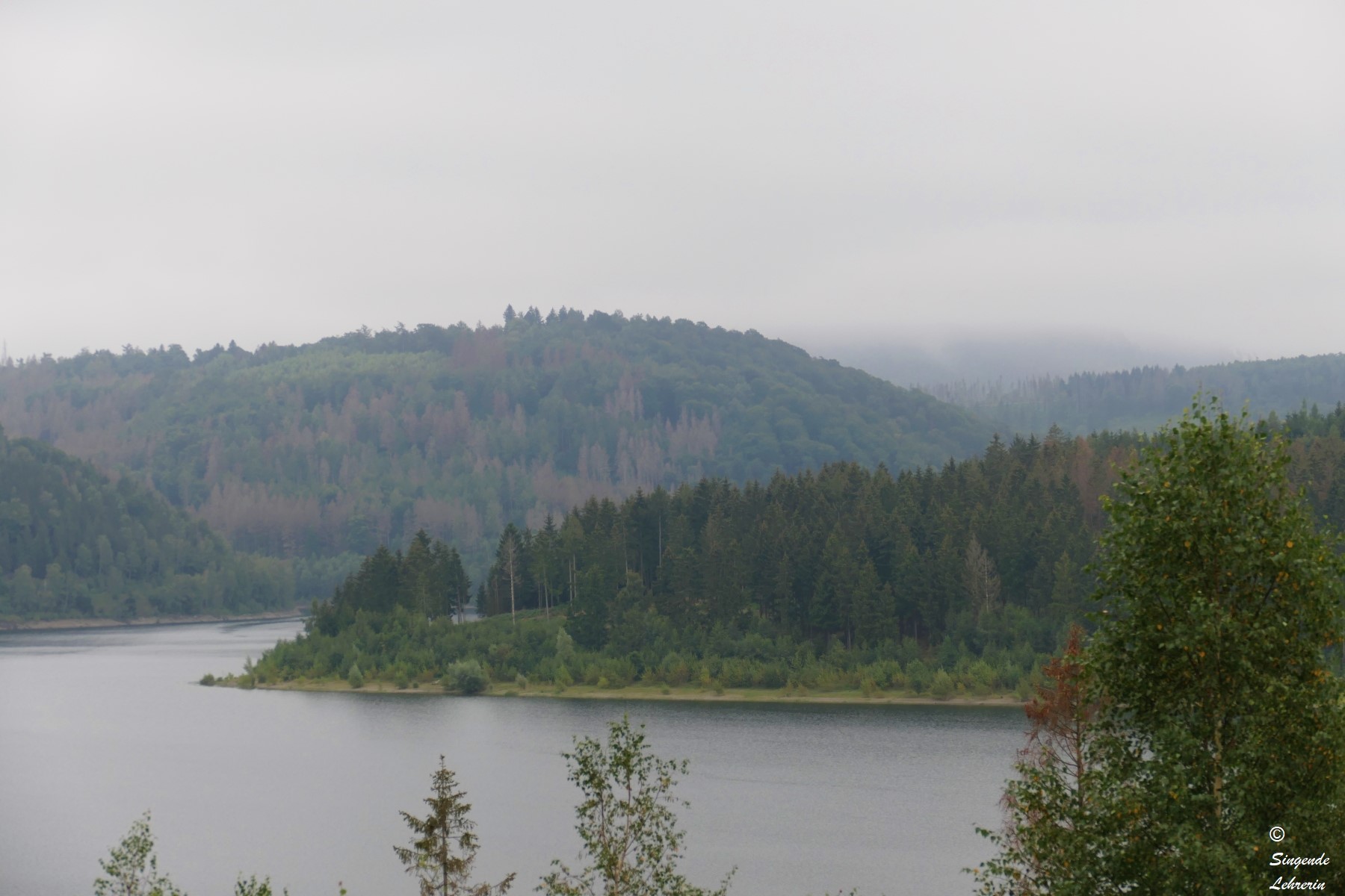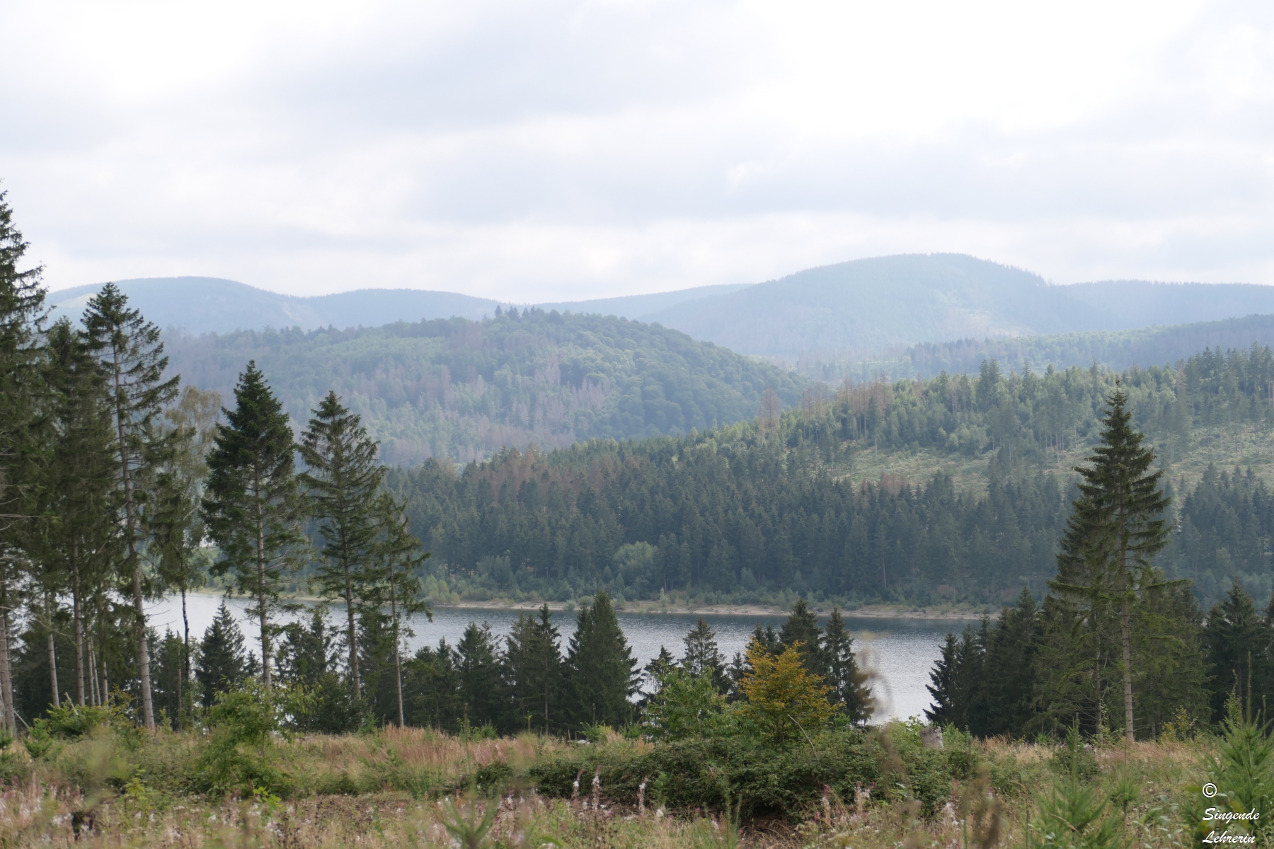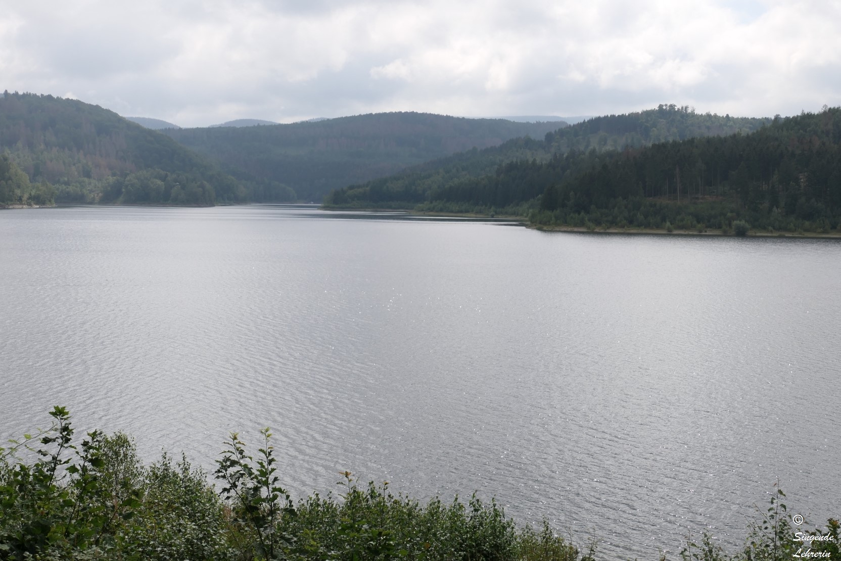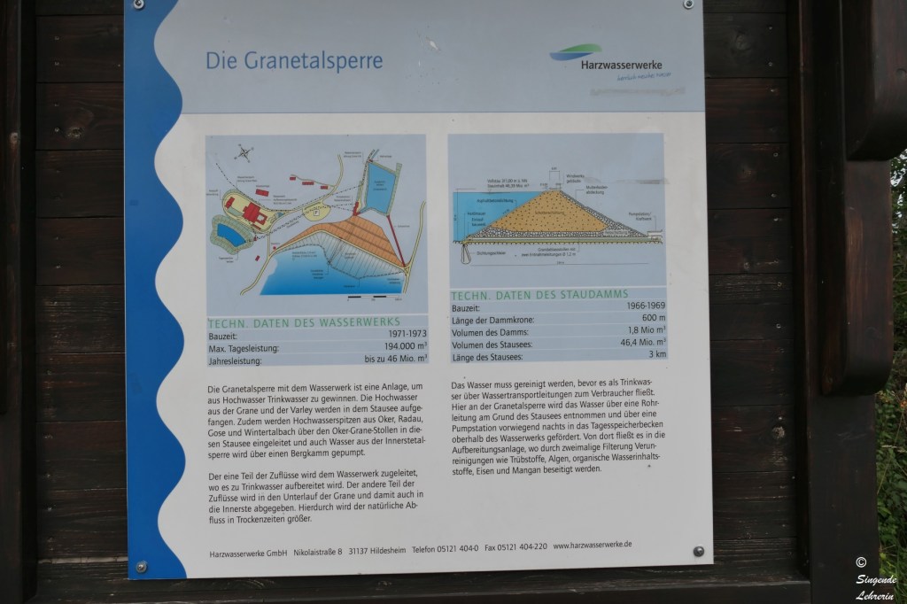 Die Wanderung dorthin war zugegebenermaßen nicht außergewöhnlich landschaftlich reizvoll, weil wir auf dem Hinweg größtenteils auf einem breiten geteerten Fahrrad- und Wanderweg liefen, ohne Blick auf den See. Wie wir später erfuhren, ist die Granetalsperre eine Trinkwassersperre, weswegen der See auch nicht zum Baden, Segeln, etc. gedacht ist. Nur an wenigen Stellen konnten wir an diesem recht trüben Tag einen Blick auf den von Wald umgebenen See werfen.