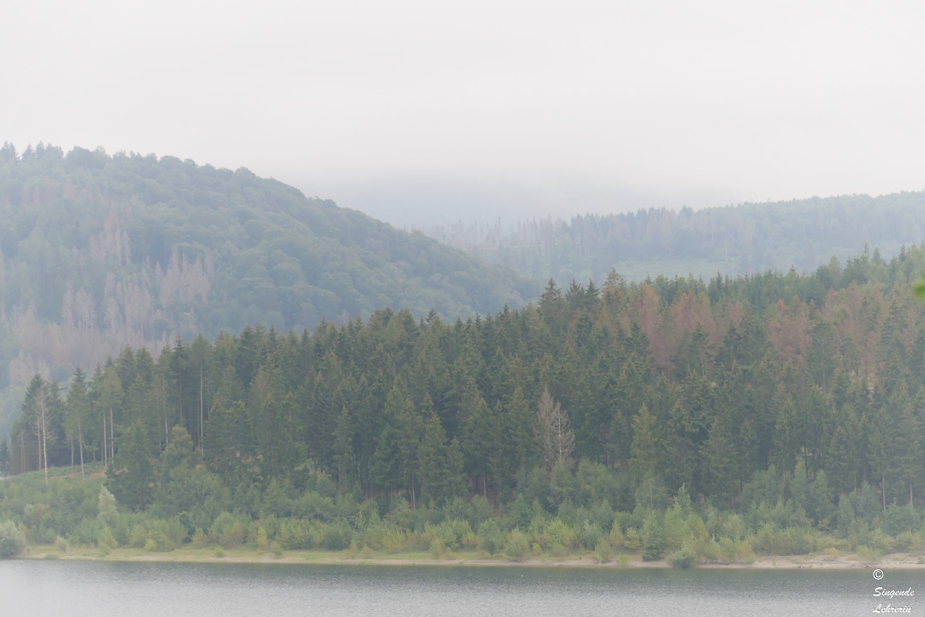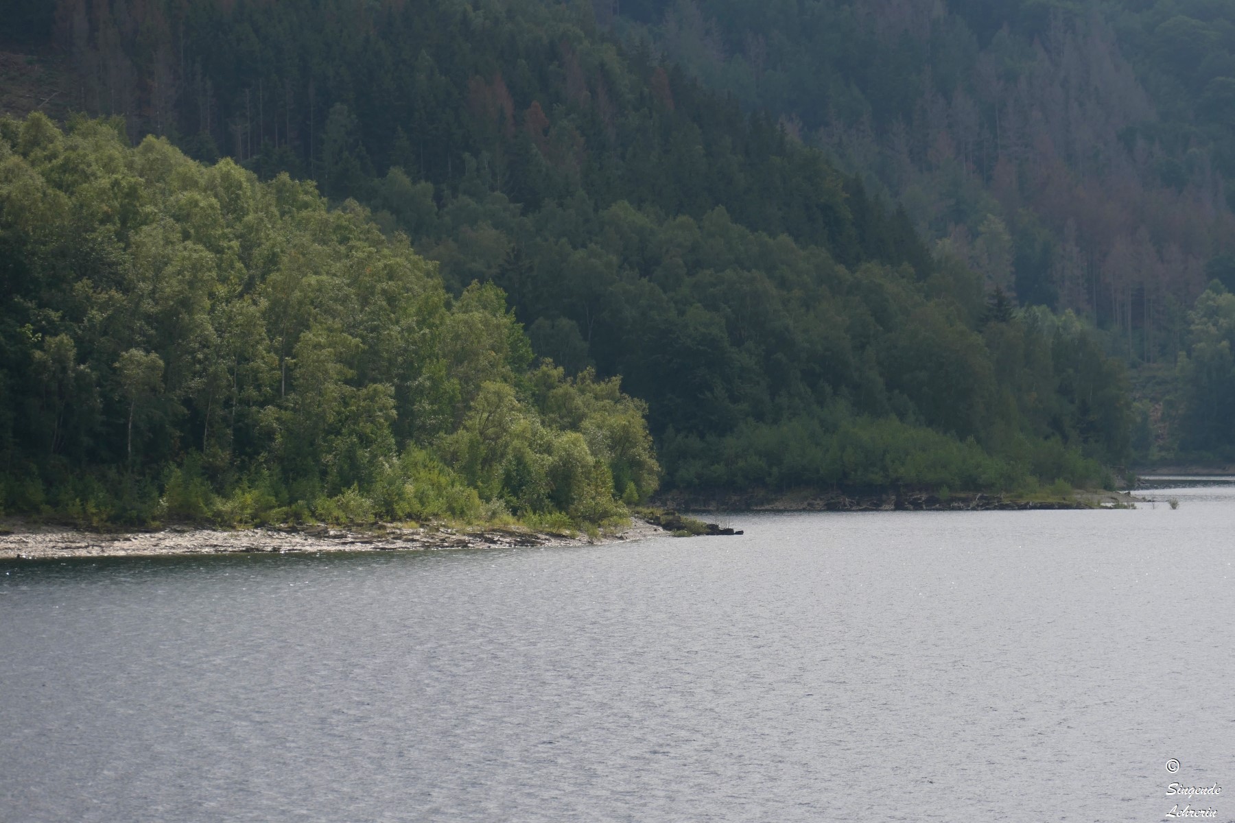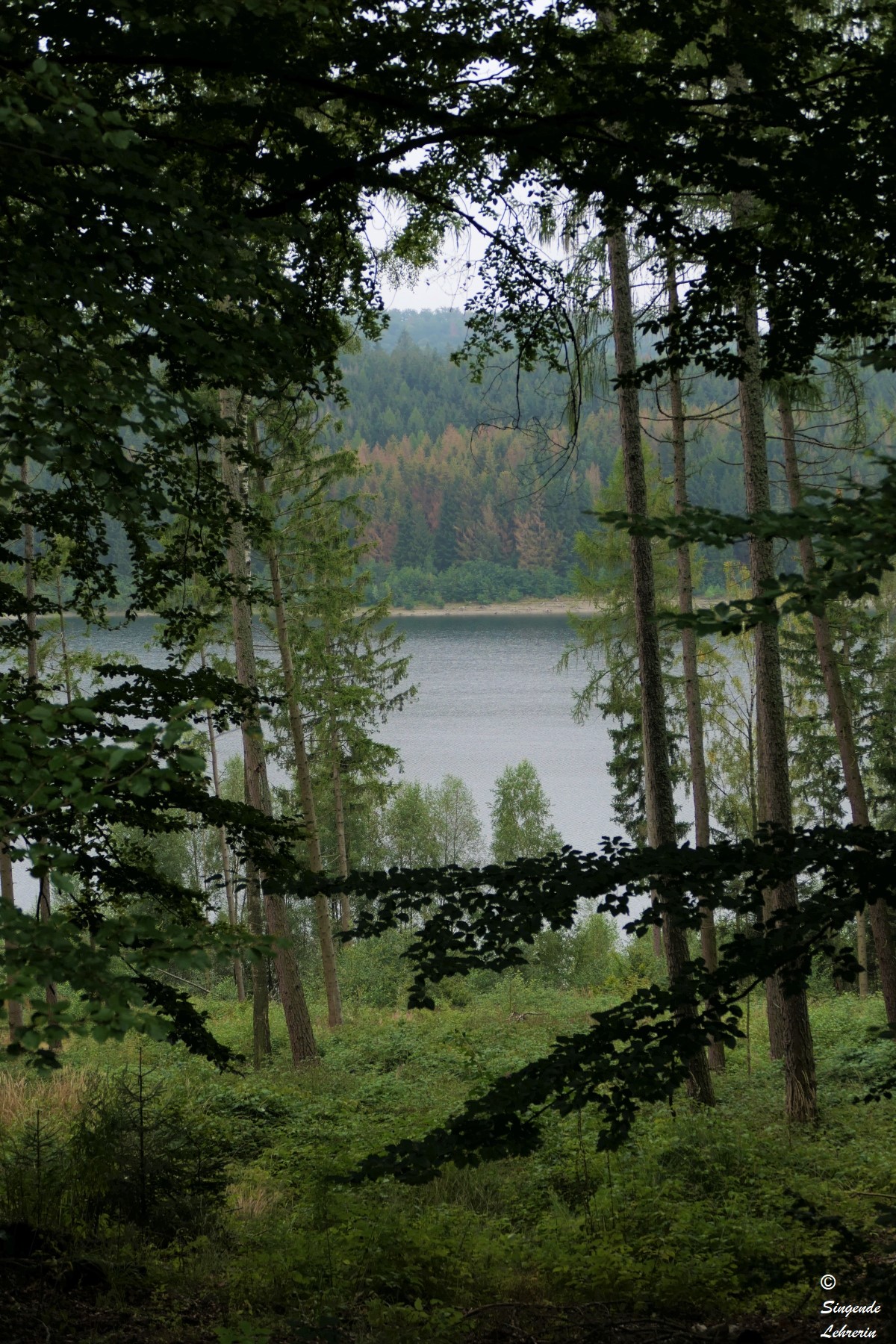 Die Wanderung dorthin war zugegebenermaßen nicht außergewöhnlich landschaftlich reizvoll, weil wir auf dem Hinweg größtenteils auf einem breiten geteerten Fahrrad- und Wanderweg liefen, ohne Blick auf den See. Wie wir später erfuhren, ist die Granetalsperre eine Trinkwassersperre, weswegen der See auch nicht zum Baden, Segeln, etc. gedacht ist. Nur an wenigen Stellen konnten wir an diesem recht trüben Tag einen Blick auf den von Wald umgebenen See werfen.