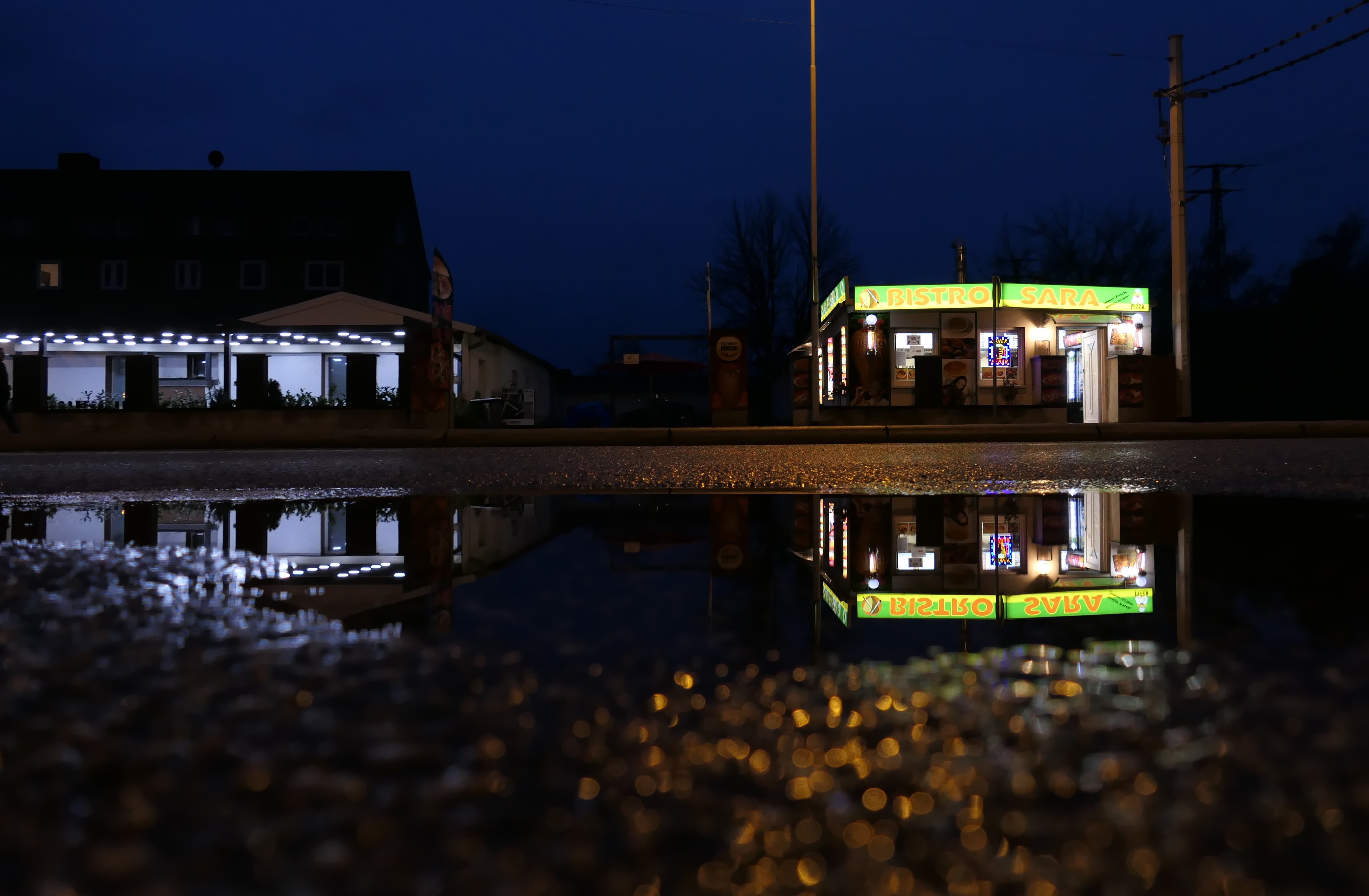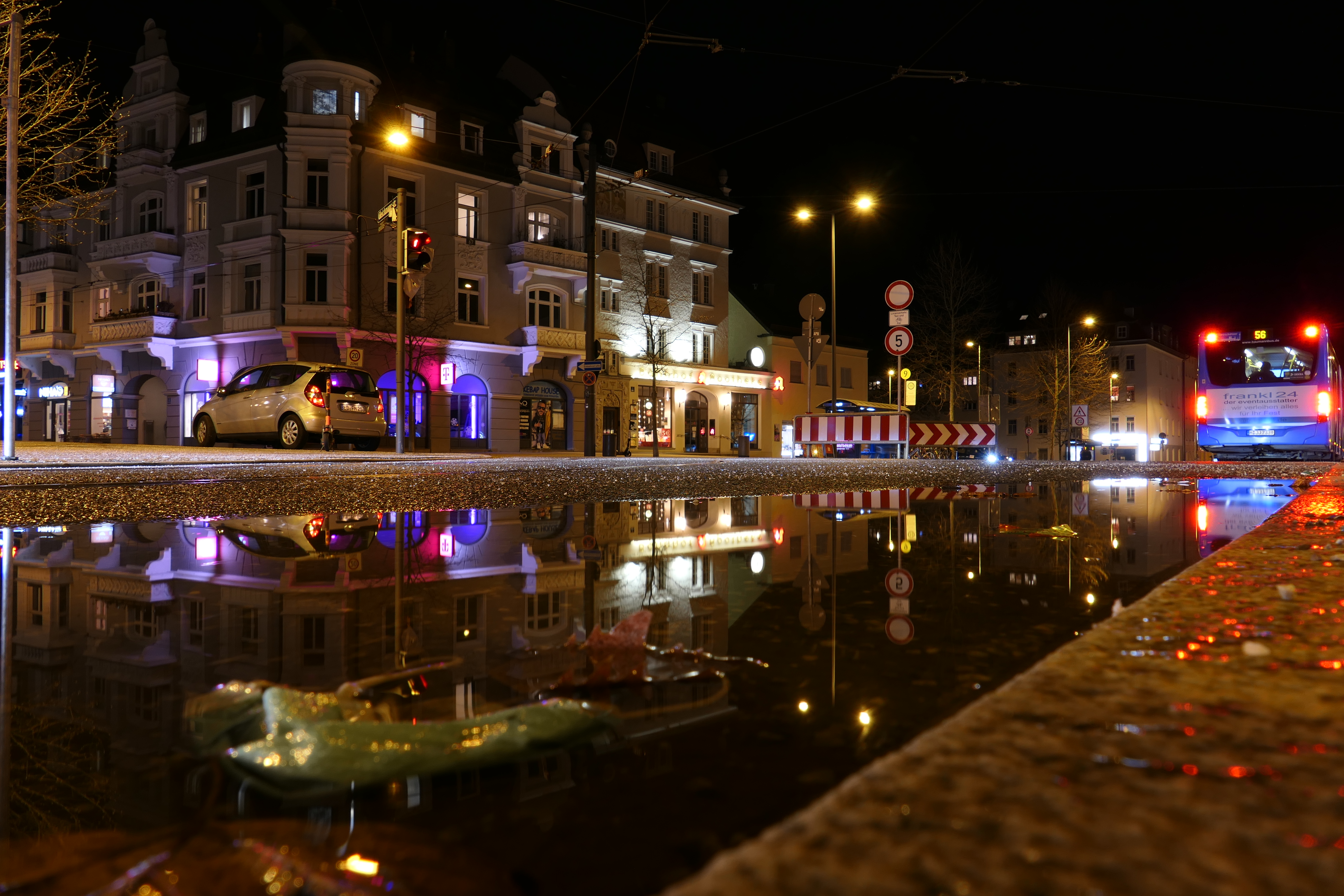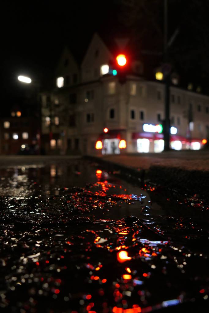 In München-Pasing bin ich dann eines Abends auch extra losgezogen, um Spiegelungen in Pfützen einzufangen (habe ich euch schon mal vorgestellt). Das funktioniert übrigens auch mit Pfützen auf Tischen o. ä.!