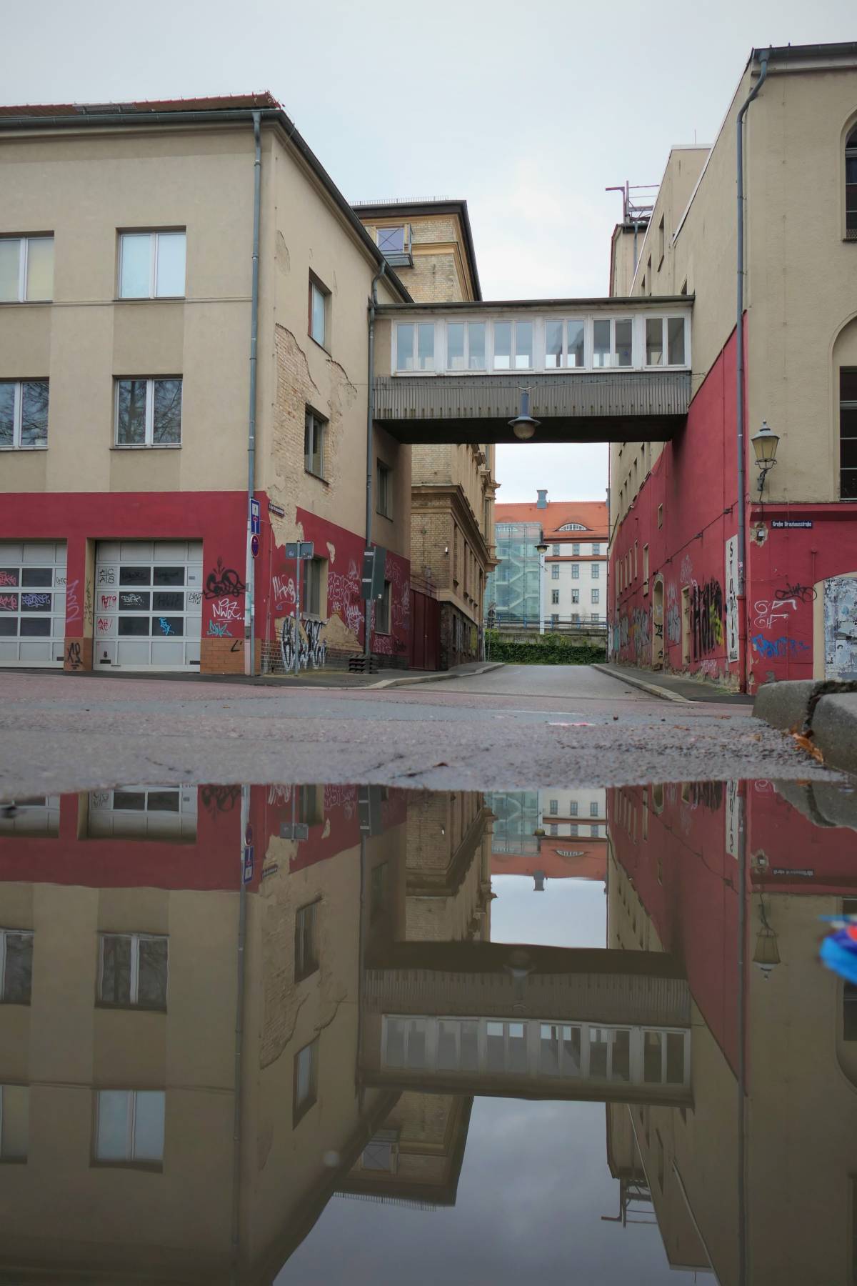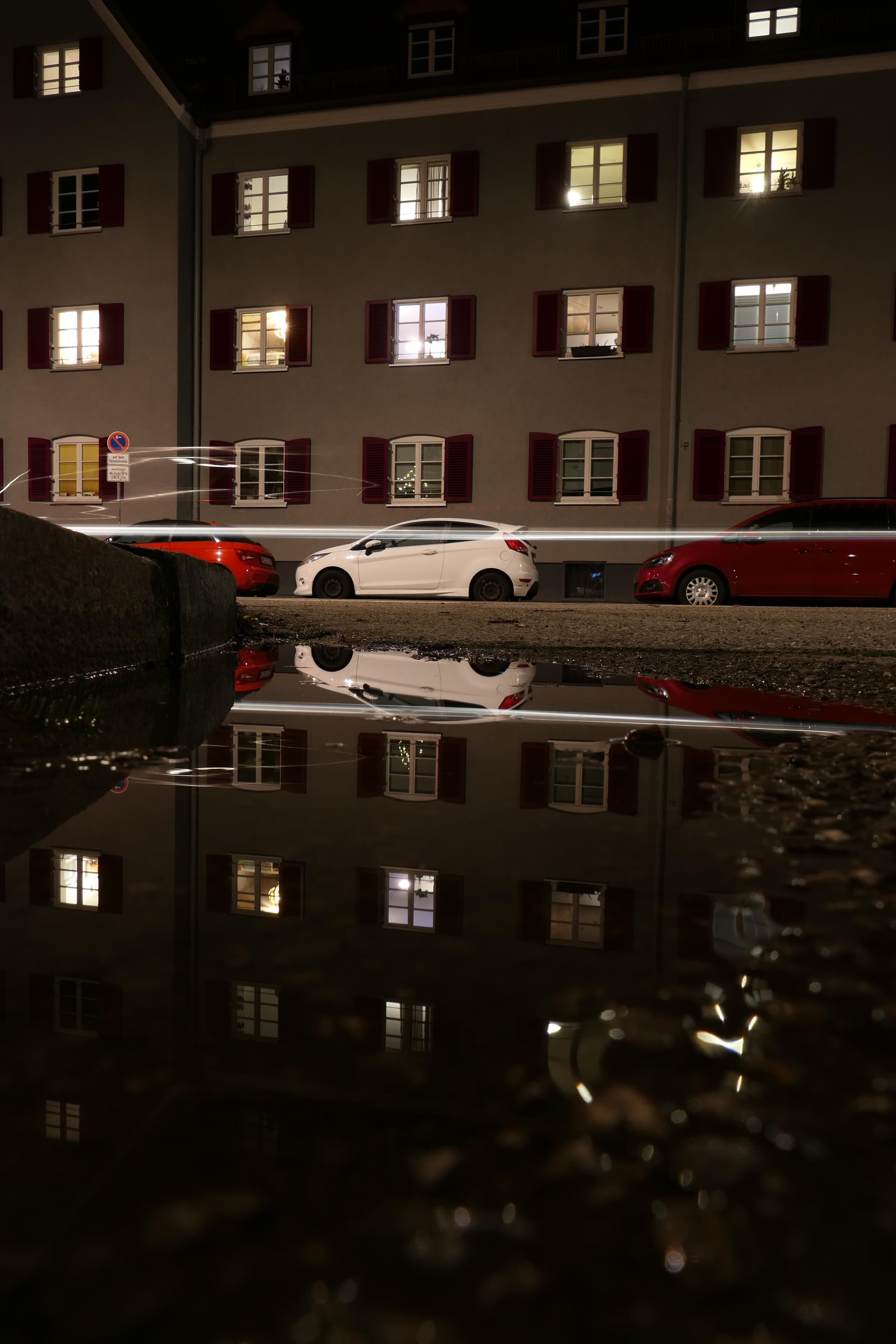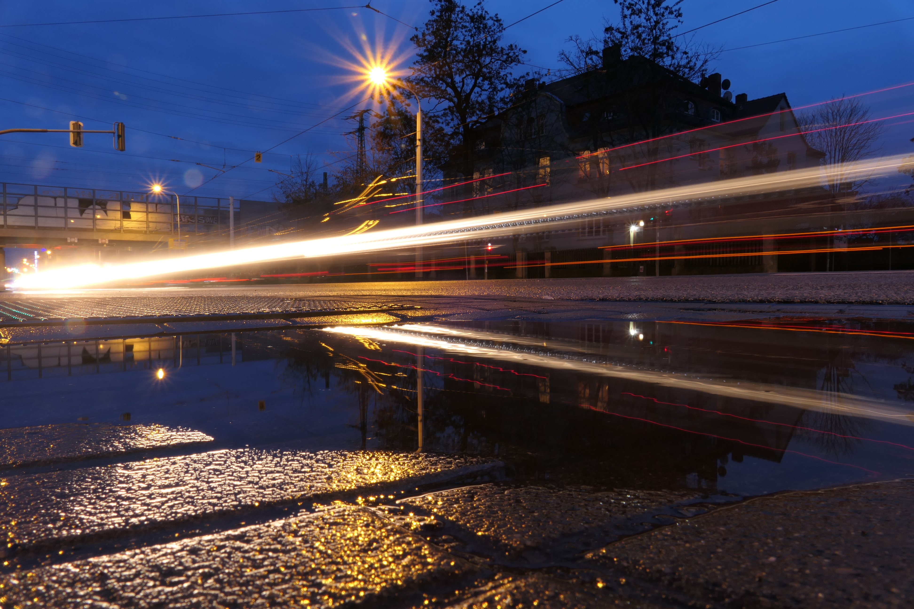 In München-Pasing bin ich dann eines Abends auch extra losgezogen, um Spiegelungen in Pfützen einzufangen (habe ich euch schon mal vorgestellt). Das funktioniert übrigens auch mit Pfützen auf Tischen o. ä.!