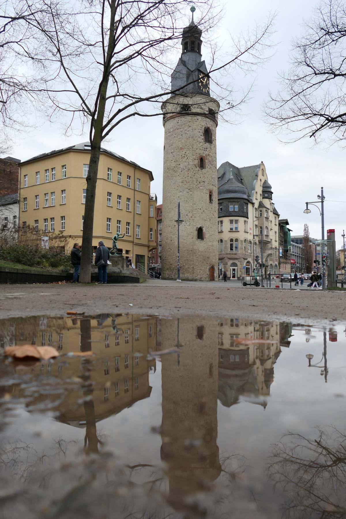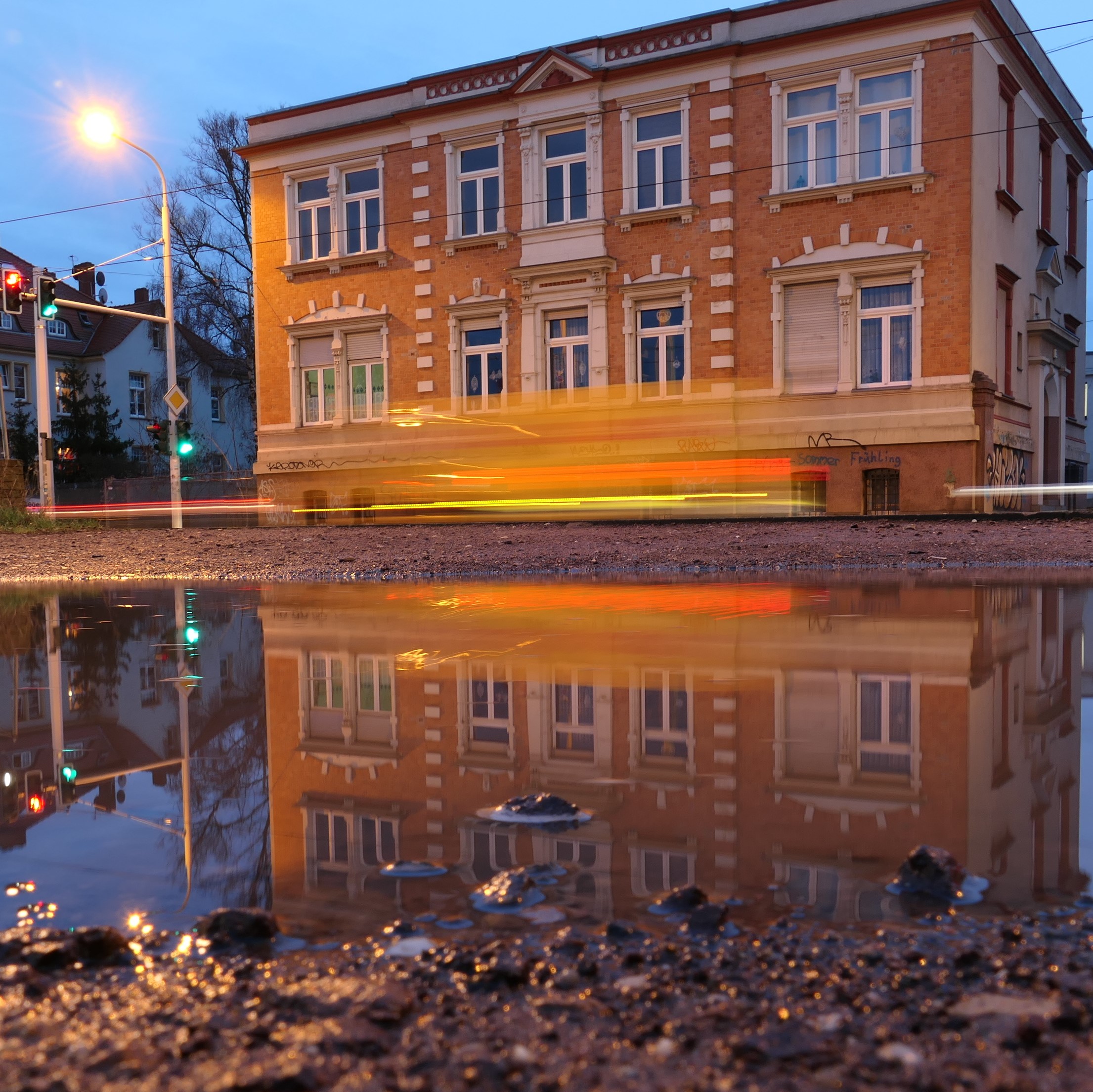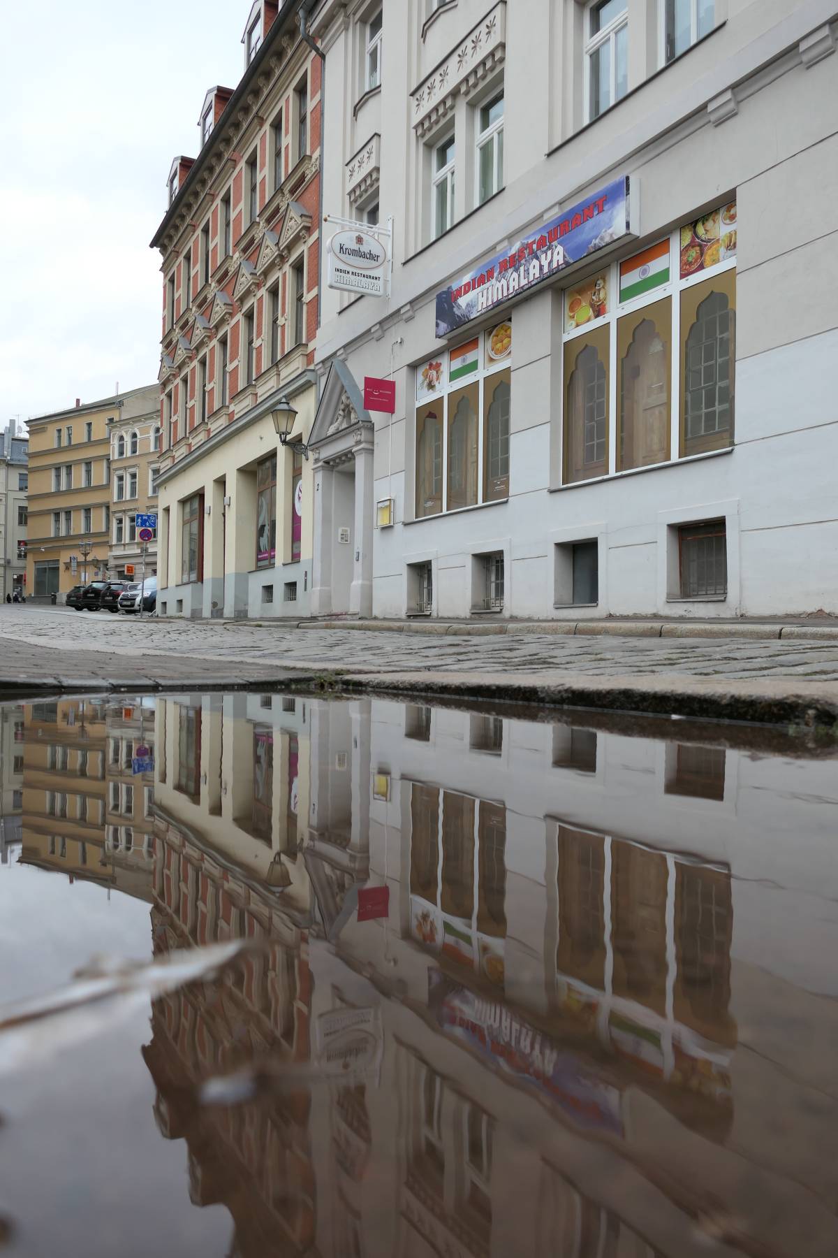 Hier noch weitere Pfützenbilder aus Halle. Die Nachtbilder entstanden, als ich tatsächlich das erste Mal in der Hoffnung losgezogen bin, vor dem Abholen meines Freundes von der Arbeit vielleicht ein paar Pfützen zu entdecken. Gar nicht so schlecht fürs erste Mal!