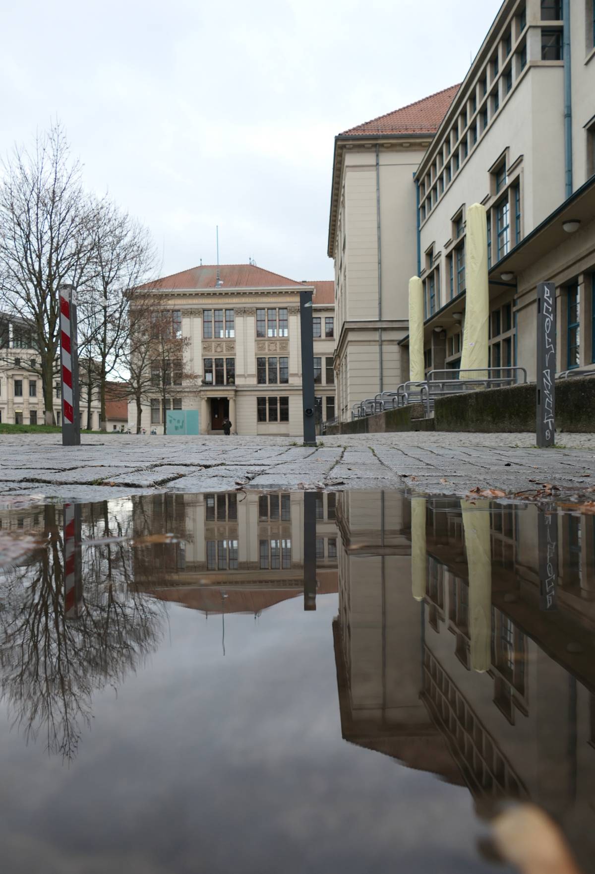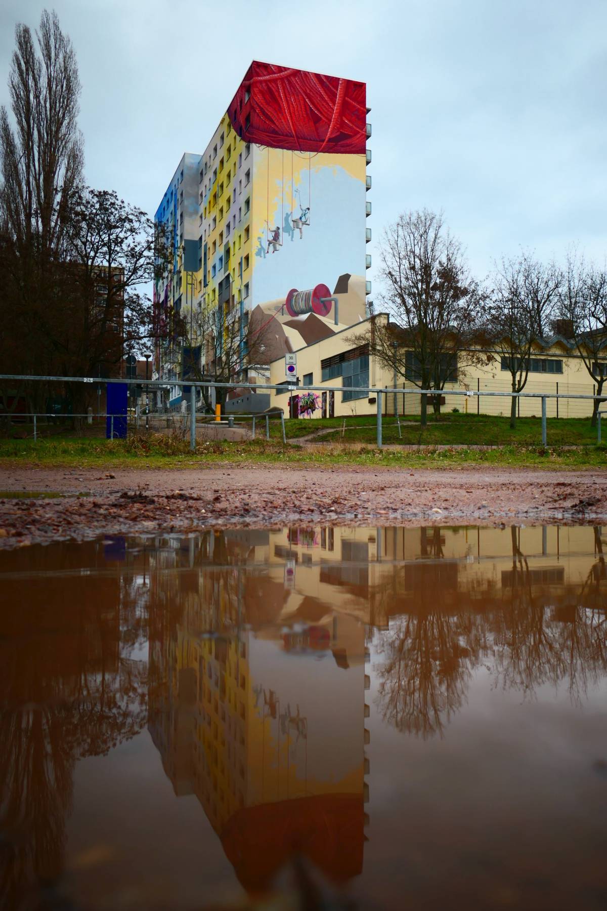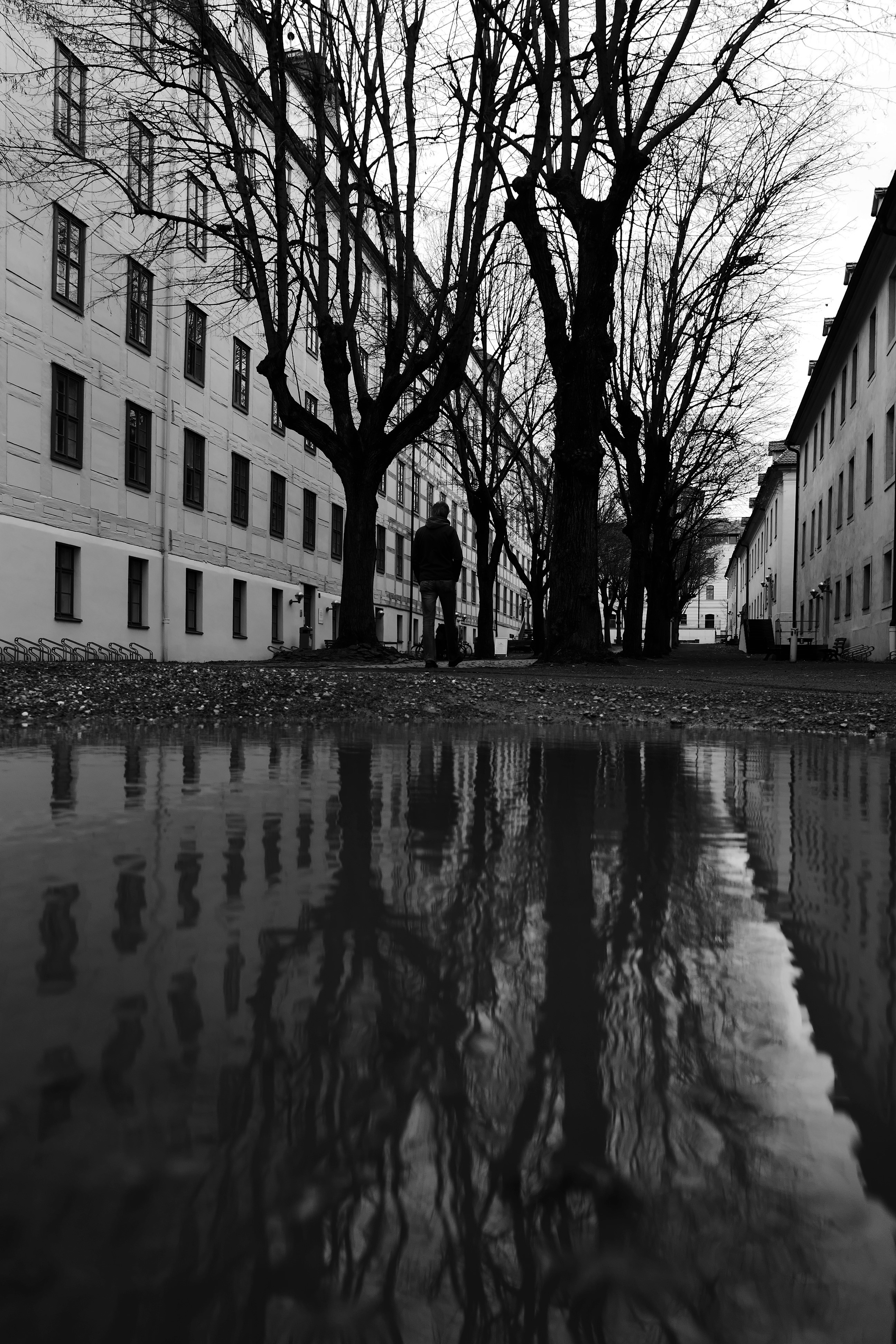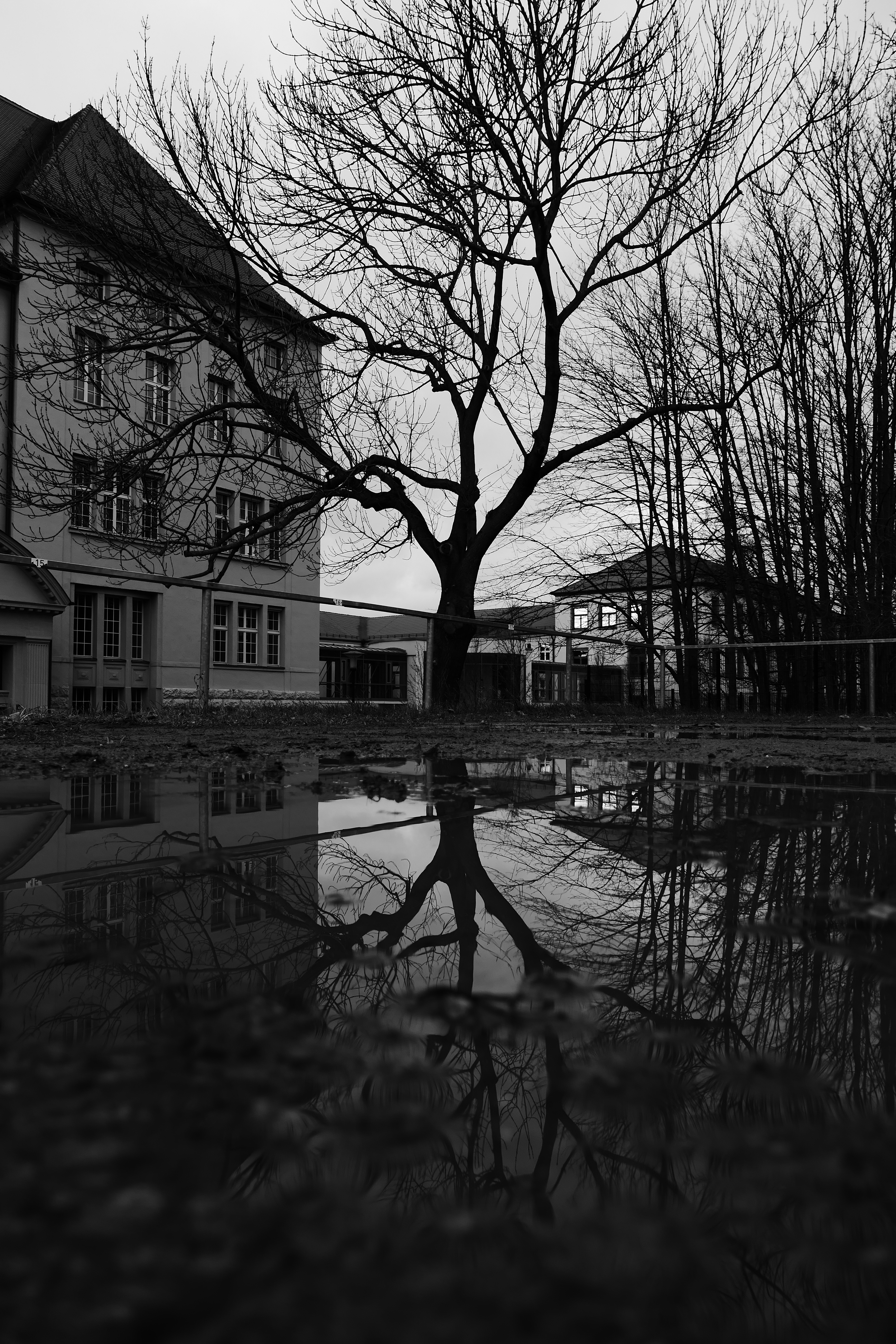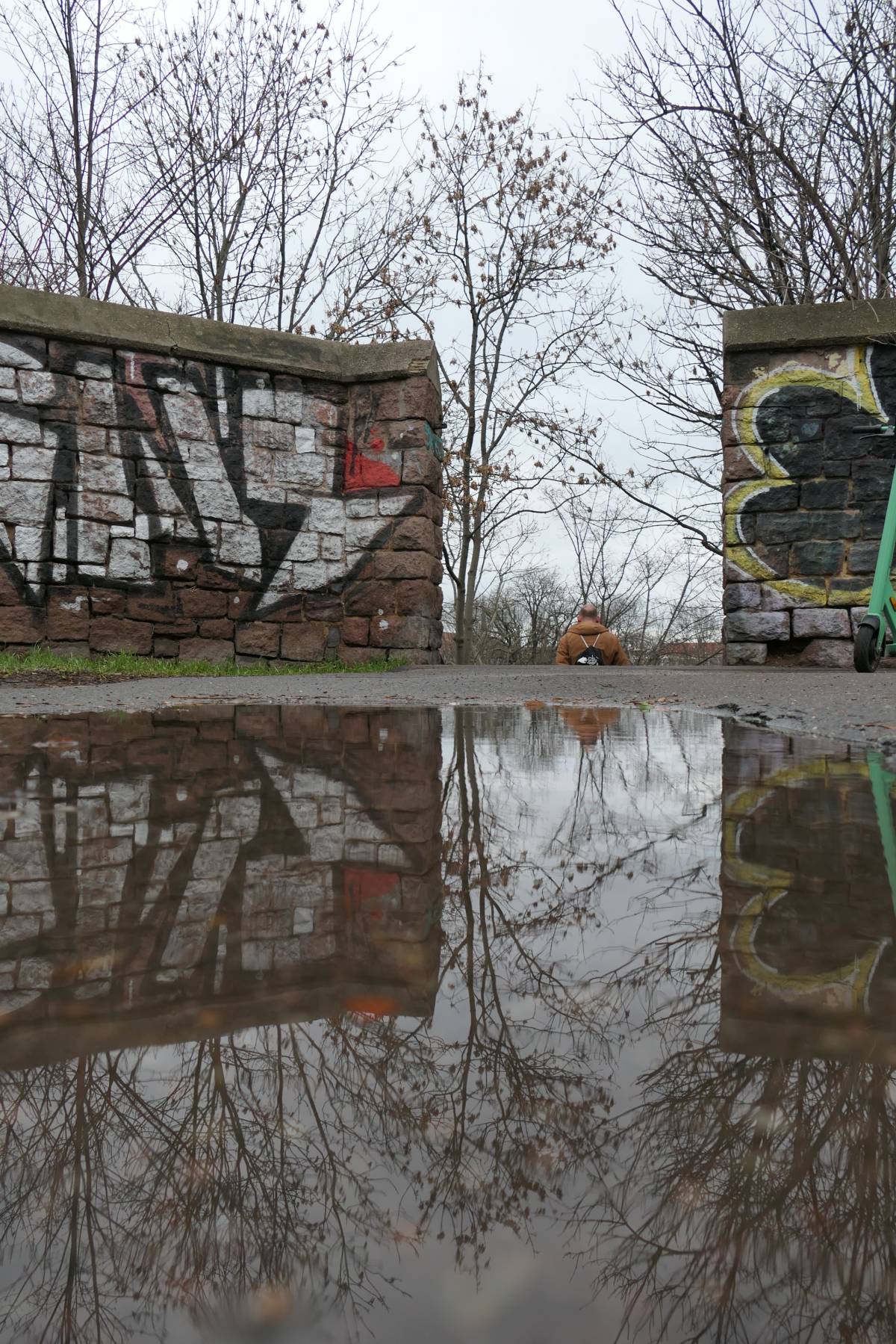 Das Essentielle bei der „Pfützenfotografie“ ist ja, dass man sich wirklich auf die Ebene der Pfütze hinunterbewegen muss, um eine gute Spiegelung einzufangen. Das habe ich erst so im Herbst bzw. Winter letzten Jahres so richtig kapiert – und als ich dann die Ergebnisse gesehen habe (und auch weitere Beispiele auf Twitter), reifte in mir der Wunsch, mal explizit nach solchen Pfützenspiegelungen zu suchen. Meine ersten Pfützenbilder stammen aus Halle: diesen Baum am Rande der Hafenbahntrasse habe ich im Herbst zufällig mit Pfütze entdeckt – das Bild daneben stammt dann aus dem „Winter“, als ich bei unserer Runde schon gehofft hatte, dass es wieder eine Pfütze dort geben würde. Man sieht schon, dass ich mich bei dem SW-Bild noch weiter runter auf die Ebene der Pfütze begeben habe, sodass es noch mehr Spiegelung gibt.