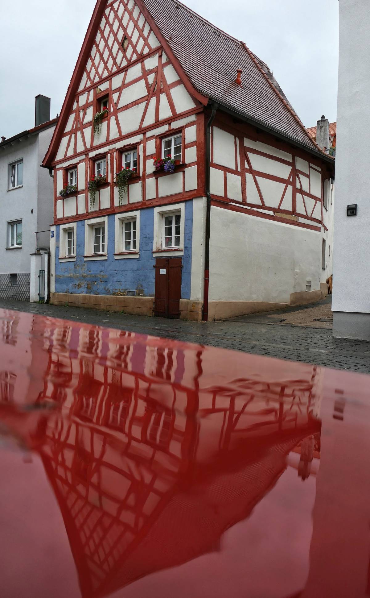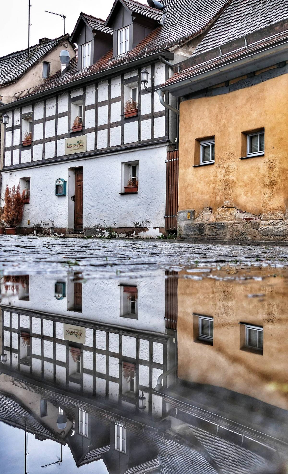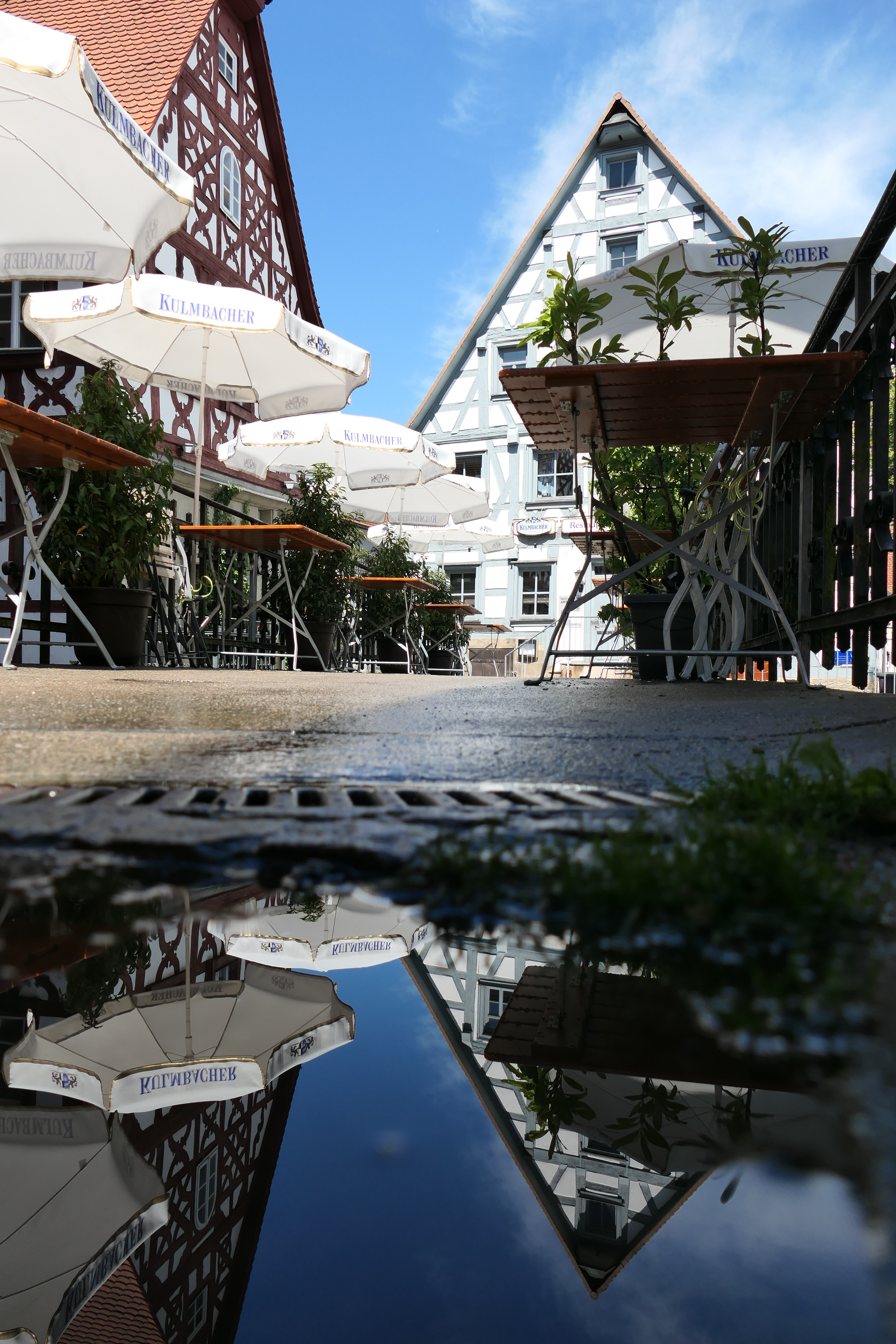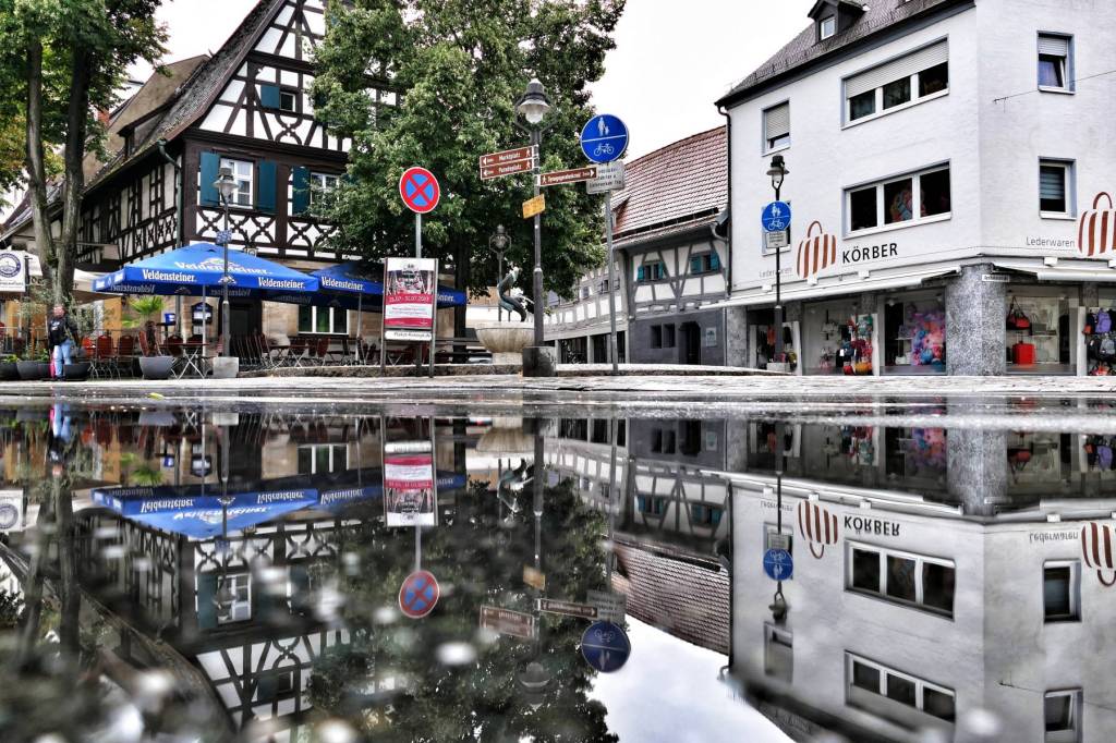 Nun war ich schon gespannt, ob sich auch die Kammerersmühle a.k.a. das „Schiefe Haus“ in einer Pfütze spiegeln würde. Auflösung: