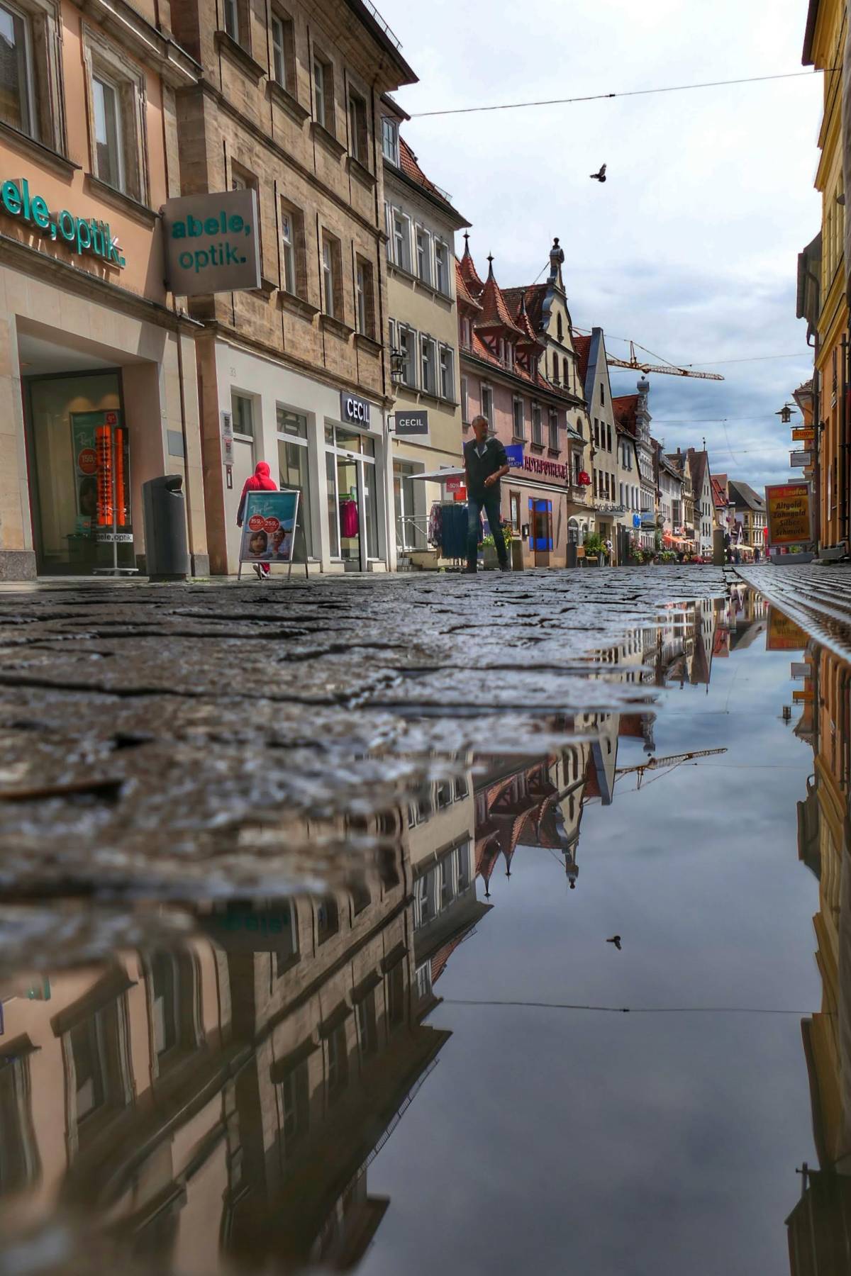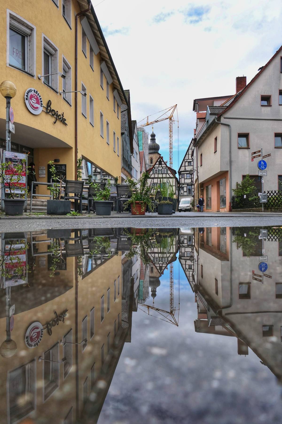 Über die obige Brücke bin ich hinüber zur Hornschuch-Allee, die mit weiteren Pfützen aufwarten konnte, während der Himmel langsam aufklarte. Ein Blick durch die Holzstraße Richtung Rathaus und St. Martin hat mir schon mal foreshadowed, dass ich wohl keinen guten Blick auf das wunderschöne Rathaus haben würde – ein riesiger Baukran!