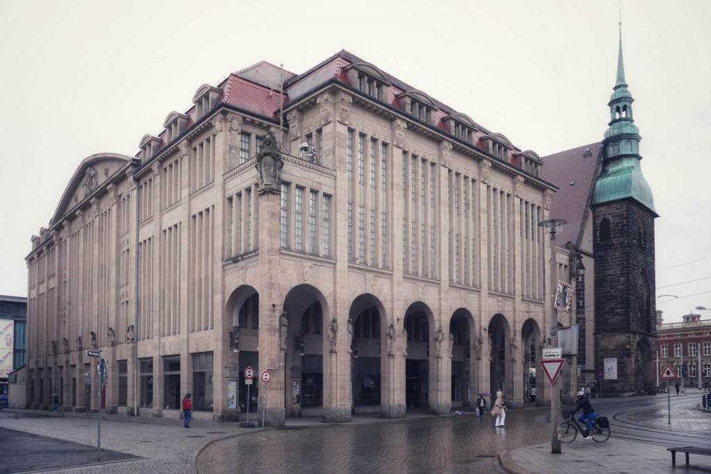 Eigentlich wollte ich an dieser Stelle etwas über „Görliwood“ und die verschiedenen Stationen auf unserer „Görliwood“-Tour erzählen. Aber ich muss leider ehrlich zugeben, dass der dauernde Regen dazu geführt hat, dass das, was wir in den Schaufenstern zu den verschiedenen Drehorten gelesen haben, quasi „weggeschwommen“ ist. Ich habe auch – mit vielleicht einer Ausnahme – keine wirklichen „Dies ist ein Drehort“-Fotos geschossen. Am interessantesten war für mich, dass GRAND BUDAPEST HOTEL, mein Lieblingsfilm von Wes Anderson, zum Teil in Görlitz gedreht wurde, aber da wir es im Vorfeld nicht geschafft hatten, den Film noch einmal anzusehen, gab es hier auch keine „Aha!“-Momente, zumal hier oft auch Räumlichkeiten genutzt wurden, die für uns als Touristen nicht zugänglich waren. Wie z. B. hier, im Kaufhaus Görlitz, dessen Innenräume als Grand Budapest Hotel fungierten: