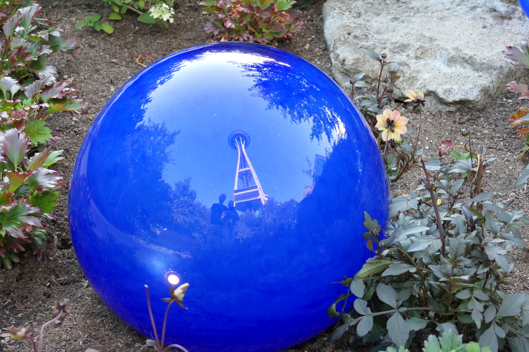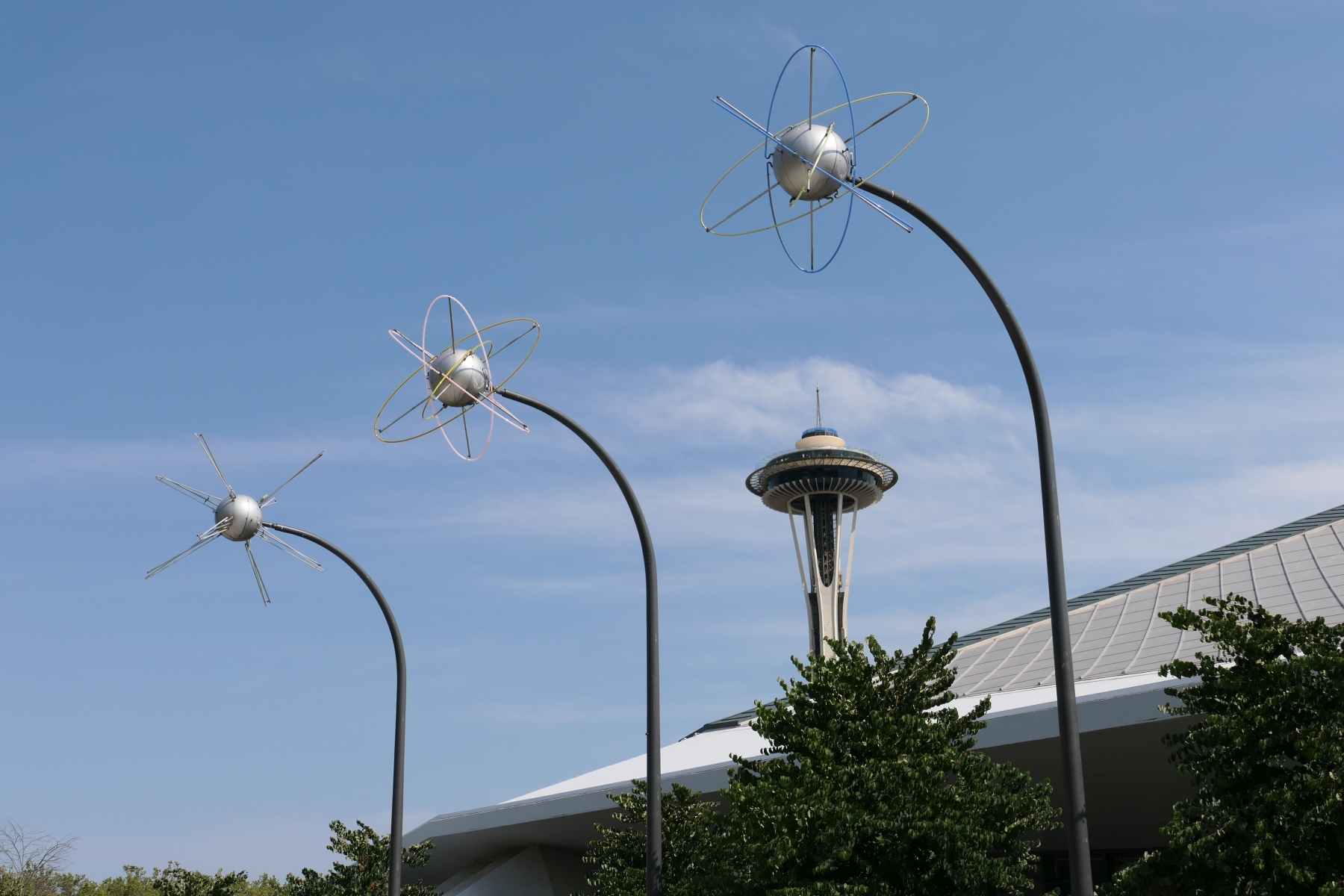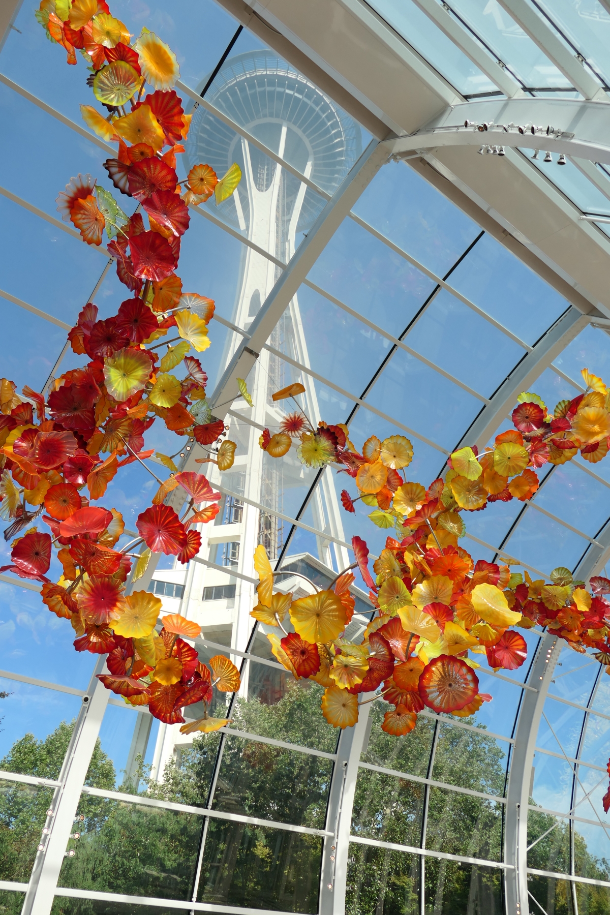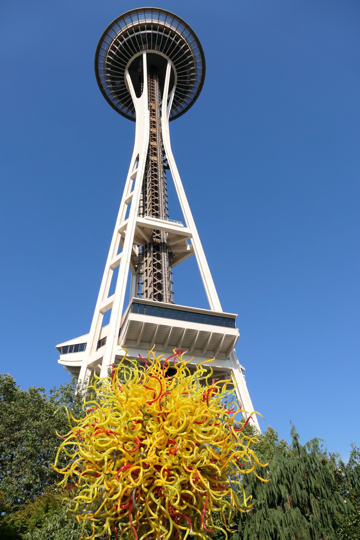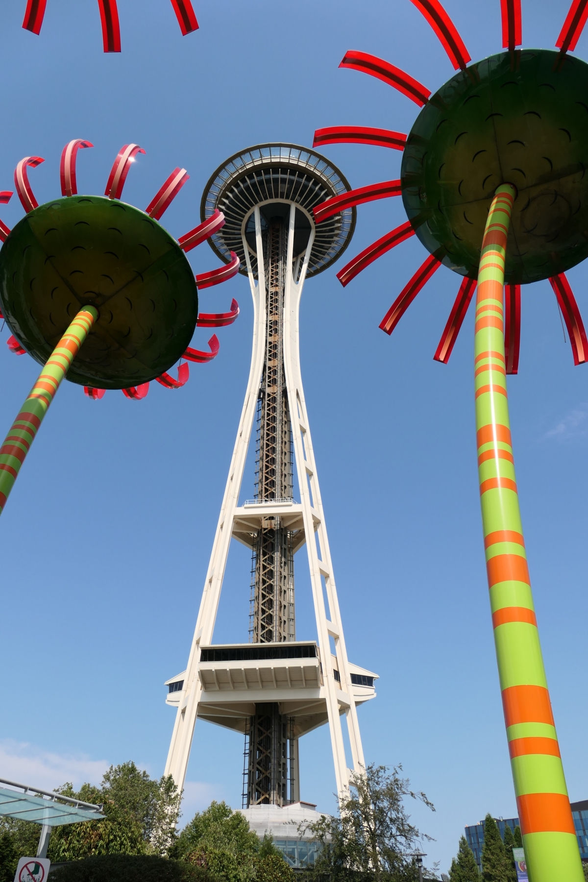 Auch vom benachbarten Chihuly Garden und Glass aus – dazu gibt es viele farbenfrohe Fotos im nächsten Beitrag – kann man die Space Needle sehen. Entweder sehr offensichtlich (aber mit interessanter Kulisse)…