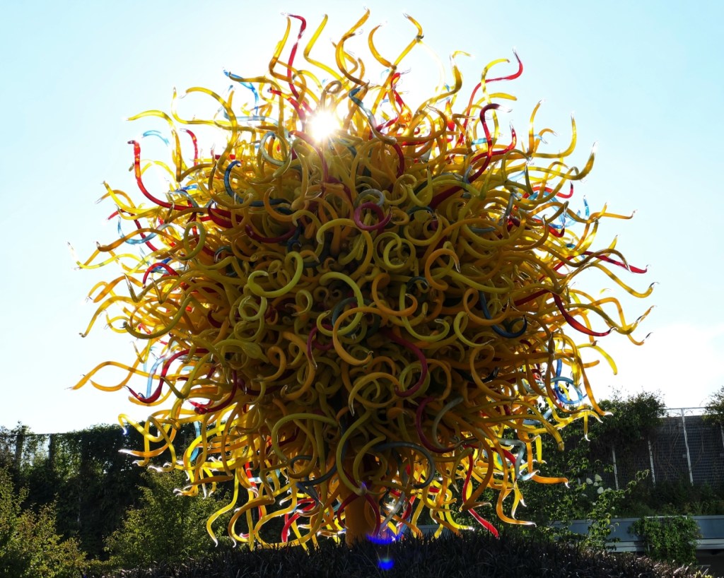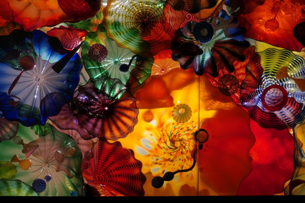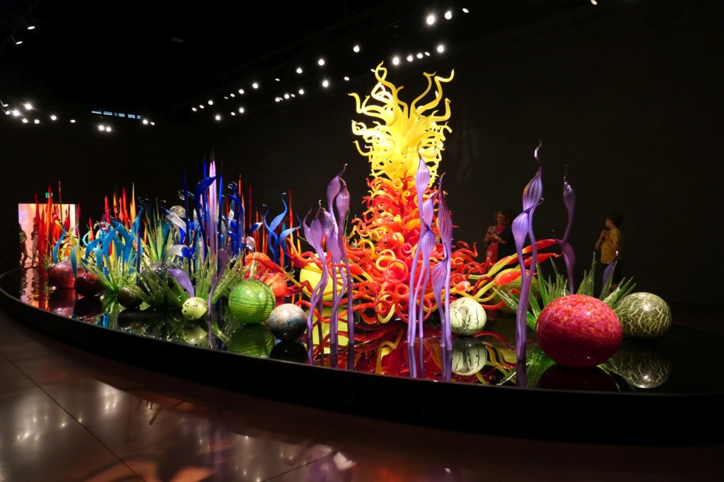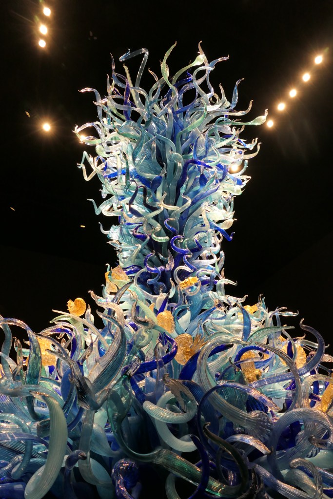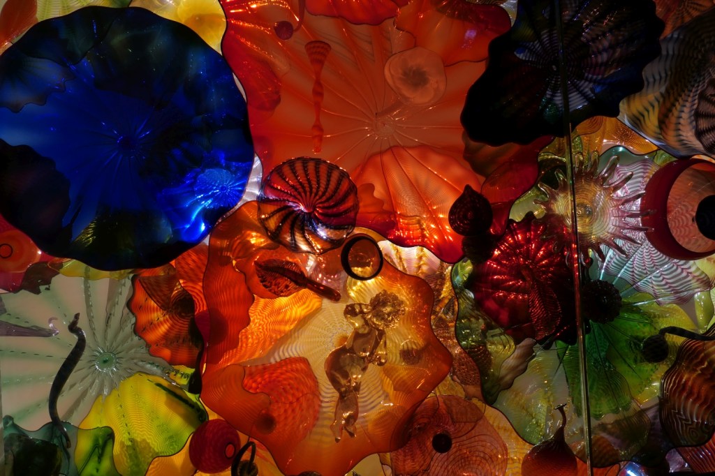 Wenn man die Auffahrt auf die Space Needle online im Voraus bucht, wird einem angeboten, dass man ein Kombi-Ticket kauft, mit dem man dann auch in Chihuly Garden and Glass gehen kann. Ich habe das mal mehr oder weniger auf gut Glück getan – und was für ein Glück war das!!! Hier verdient jede fotografierte Glasskulptur von Dale Chihuly, der in Tacoma, WA, geboren und aufgewachsen ist, im Grunde genommen eine eigene Seite. Ich empfehle zumindest, diesen Beitrag nicht nur auf dem Handy anzusehen.