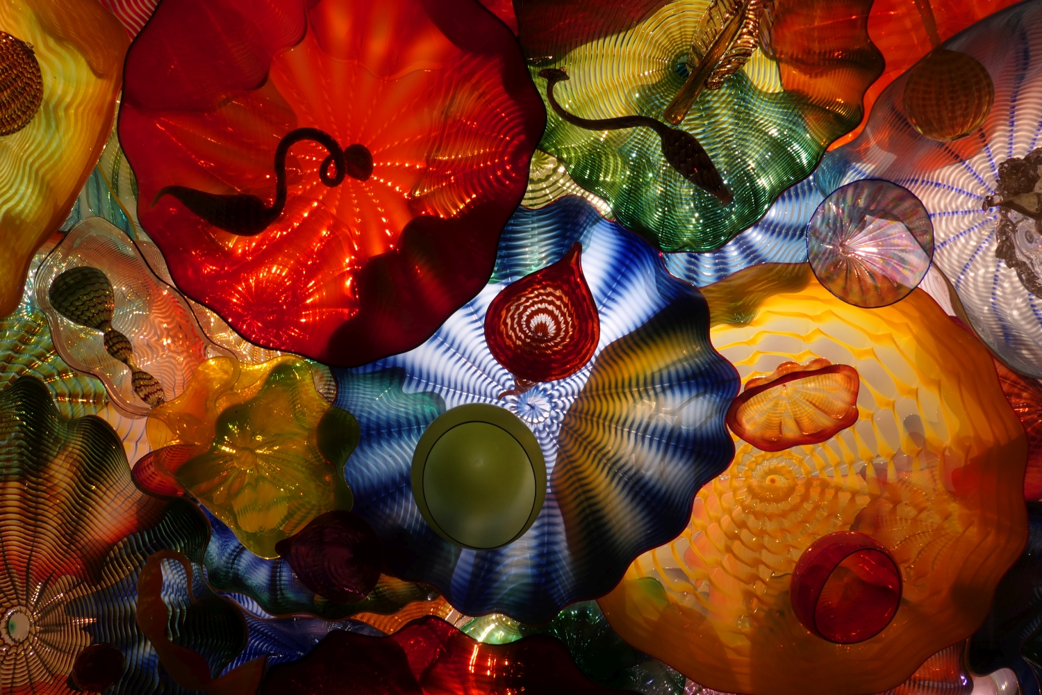 I’ve been inspired by so many things, one of which was growing up in a garden that my mother had. She had beautiful rhododendrons and azaleas and I would get to play in the garden and be around all these beautiful, natural forms. It also had a big influence on me, I think, in terms of color. Many of the installations are on black Plexiglas; a reflective surface. I love to work with reflective material. It gives a totally different dimension to the work, and the perspective changes as you move around the piece. – Dale Chihuly