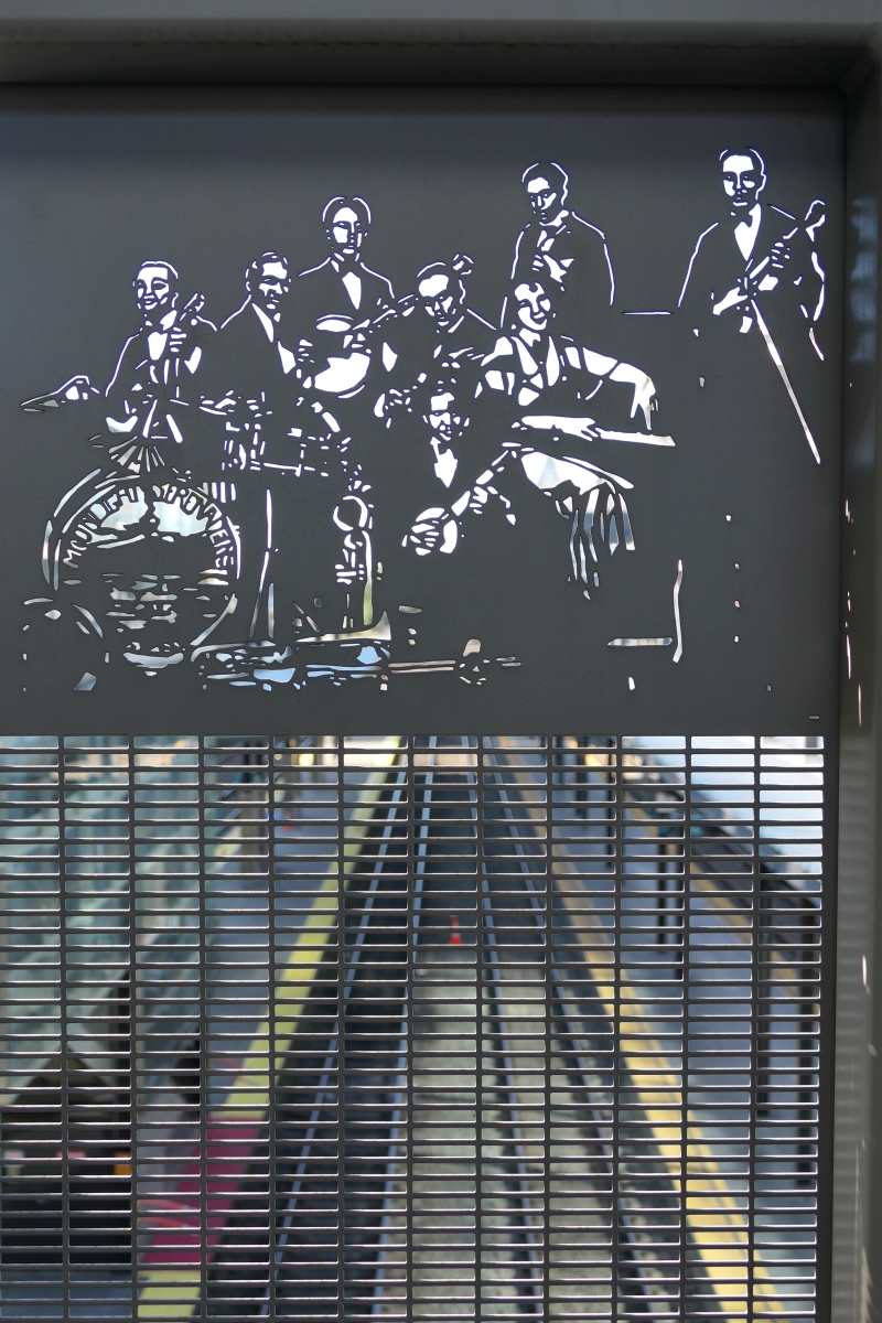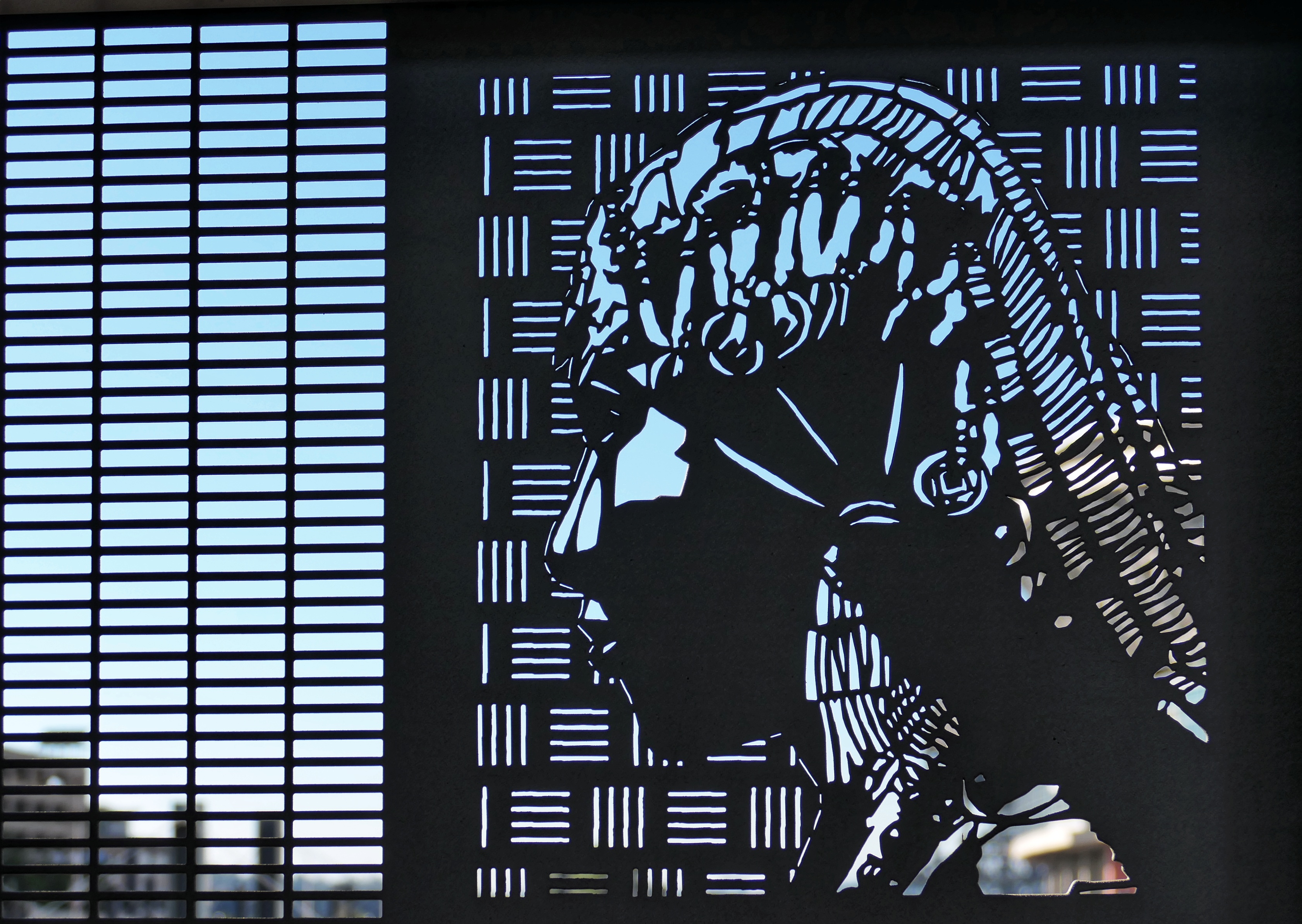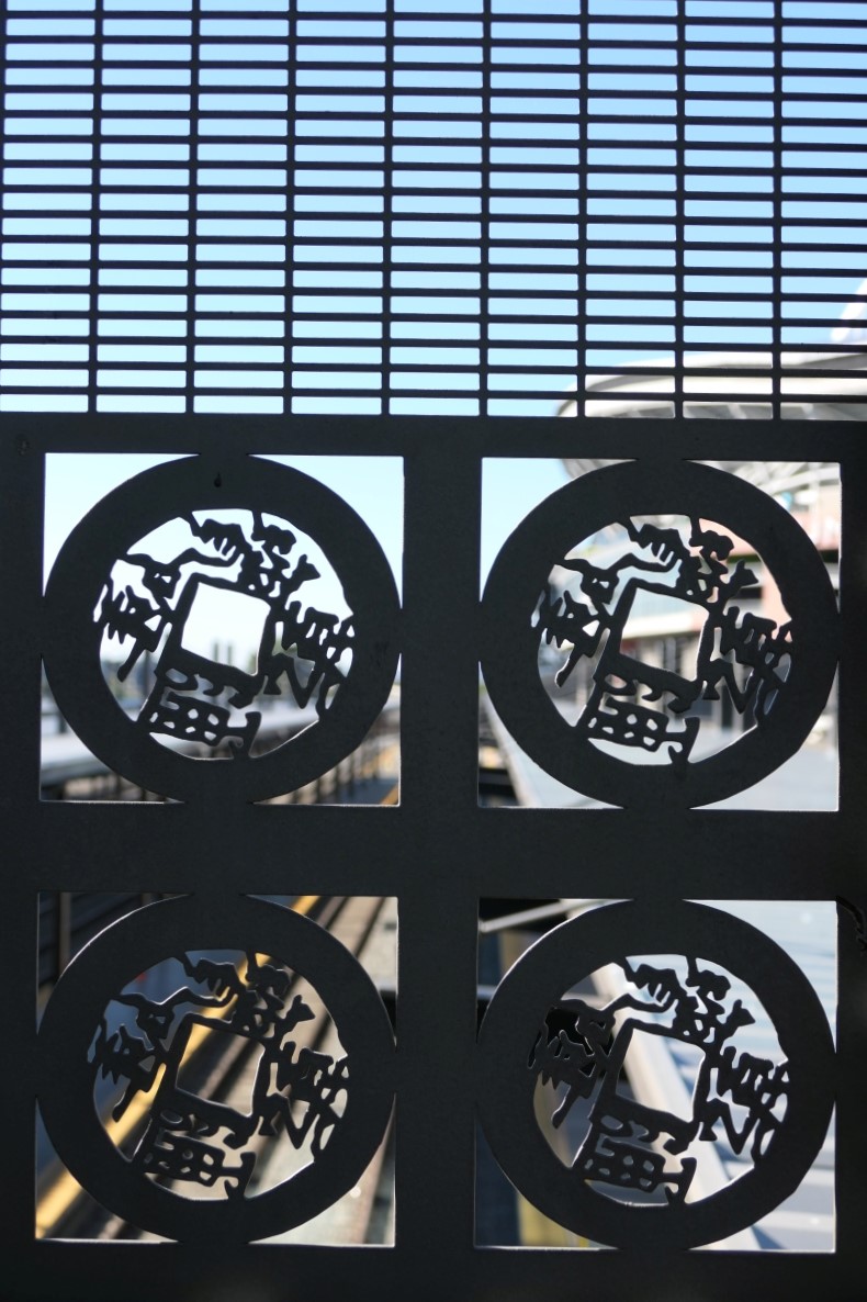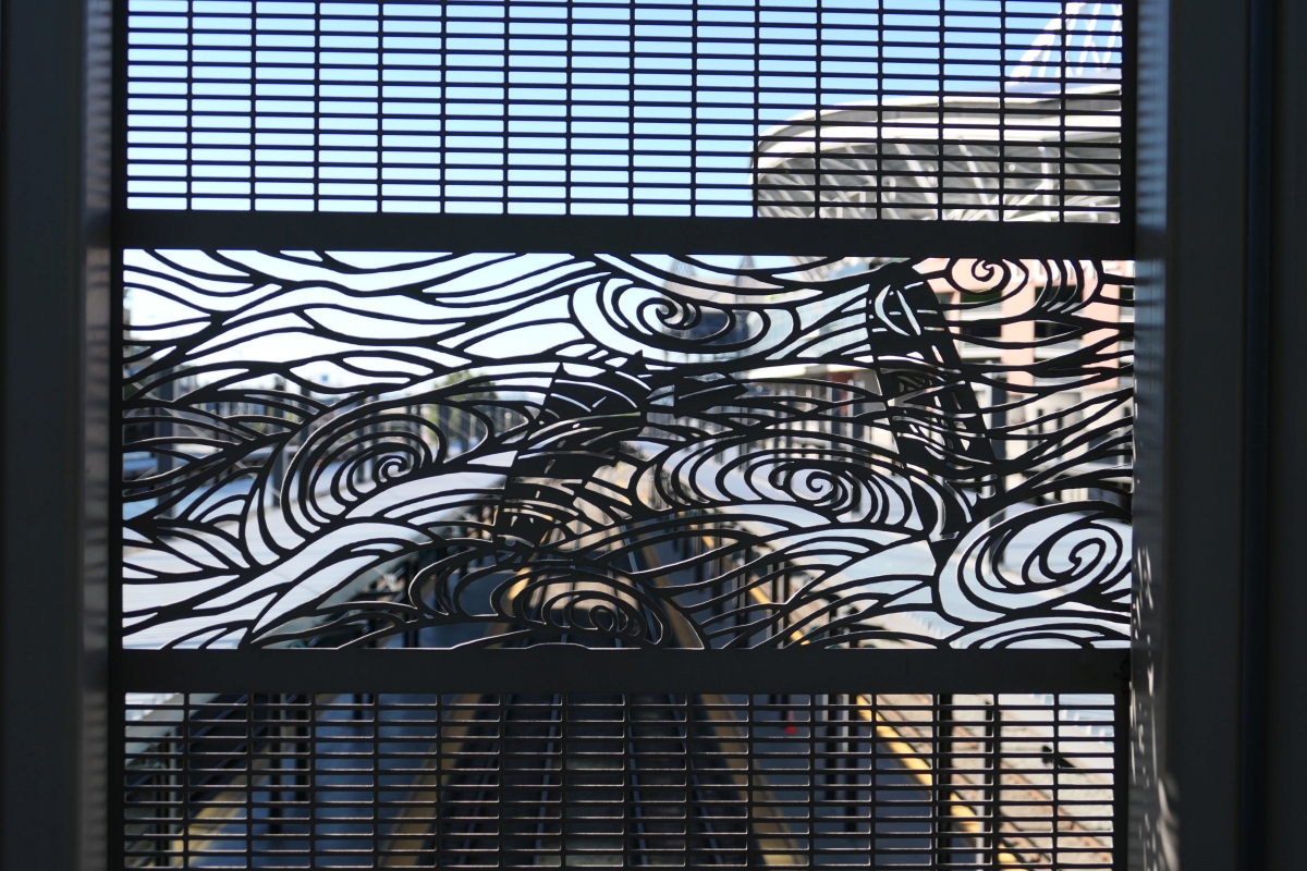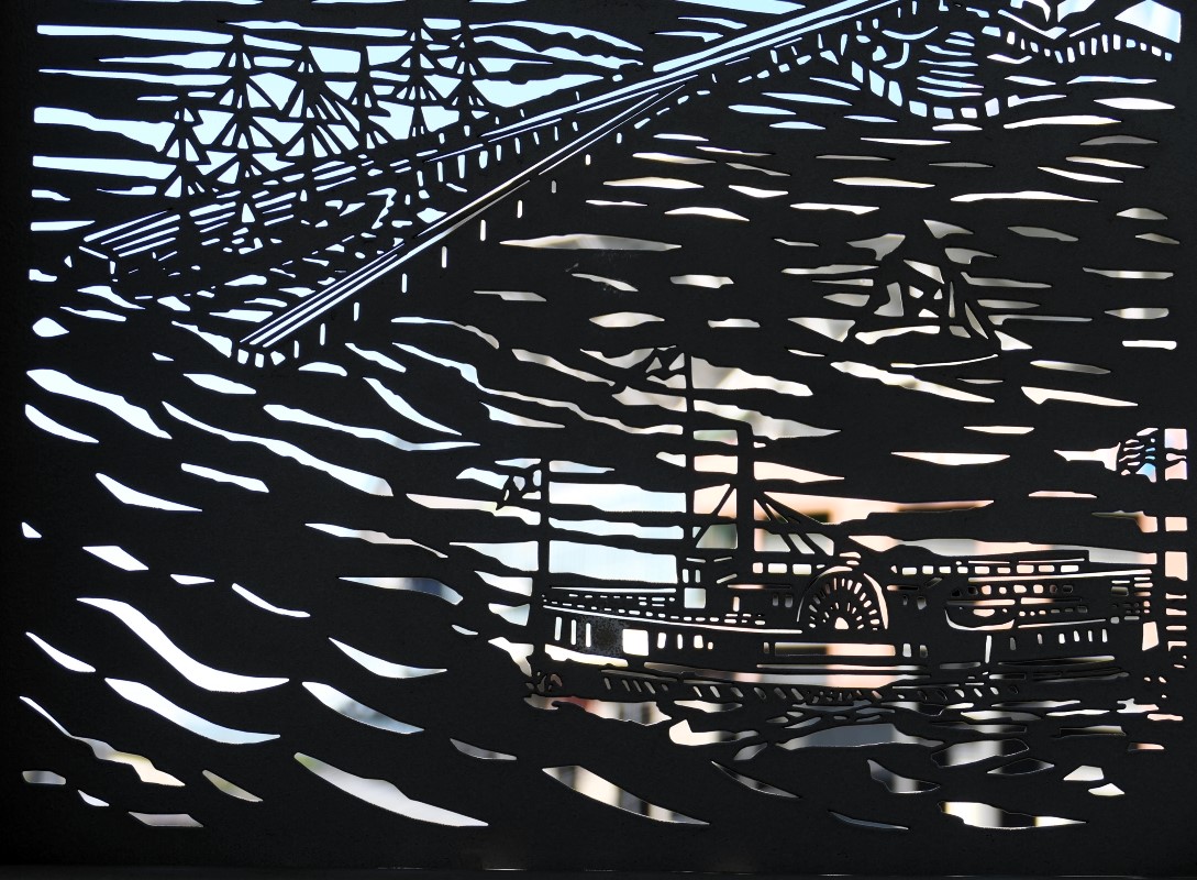 Inspired by the area’s historical and ongoing cultural connections, the artists created 40 hand-cut paper pieces with images of trade, salmon, sports, music, trains, navigation, and immigration—and those images were then laser-cut into the steel latticework on the south side of the bridge. As light passes through the metal—day and night—it casts shadows like a set of theatrical gobos, transforming the bridge into a dreamlike lantern. Quelle: https://www.4culture.org/public_art/bridge-between-cultures/