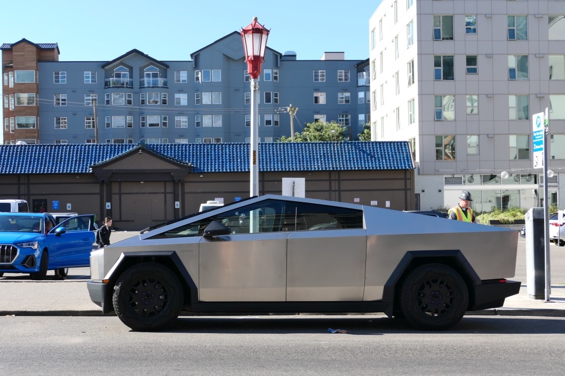 Hier haben wir den ersten Tesla Cybertruck gesehen, ein monströses Gefährt.