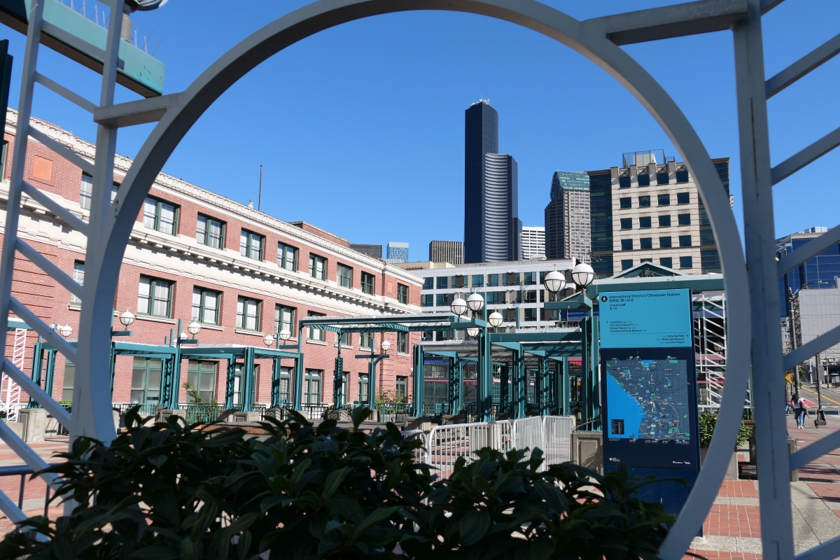 Über die Fußgängerbrücke Weller Street Bridge über die Bahngleise, die zur King Station führen (zum Bahnhof später mehr) ging es Richtung International District / Chinatown. Die Südseite der Brücke wurde von zwei Künstlerinnen (Nanda D’Agostino and Valerie Otani) zu einer Bridge between Cultures gestaltet: