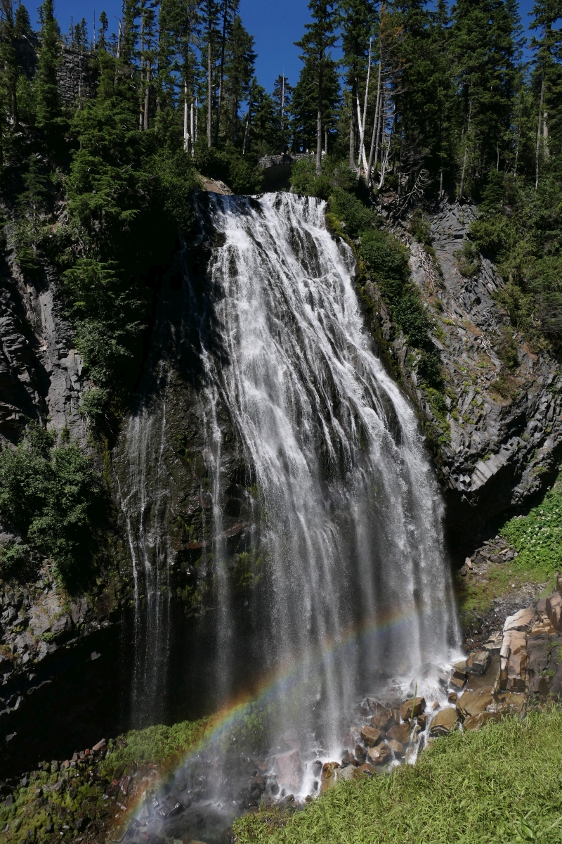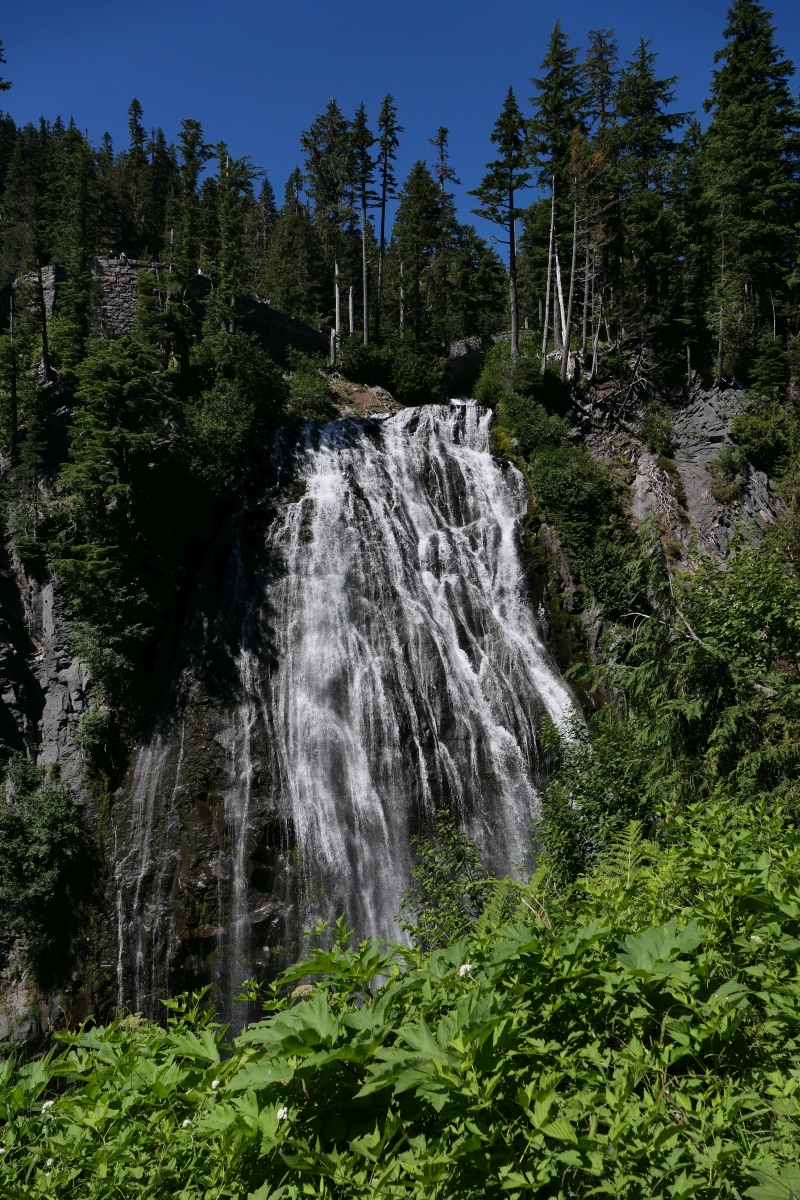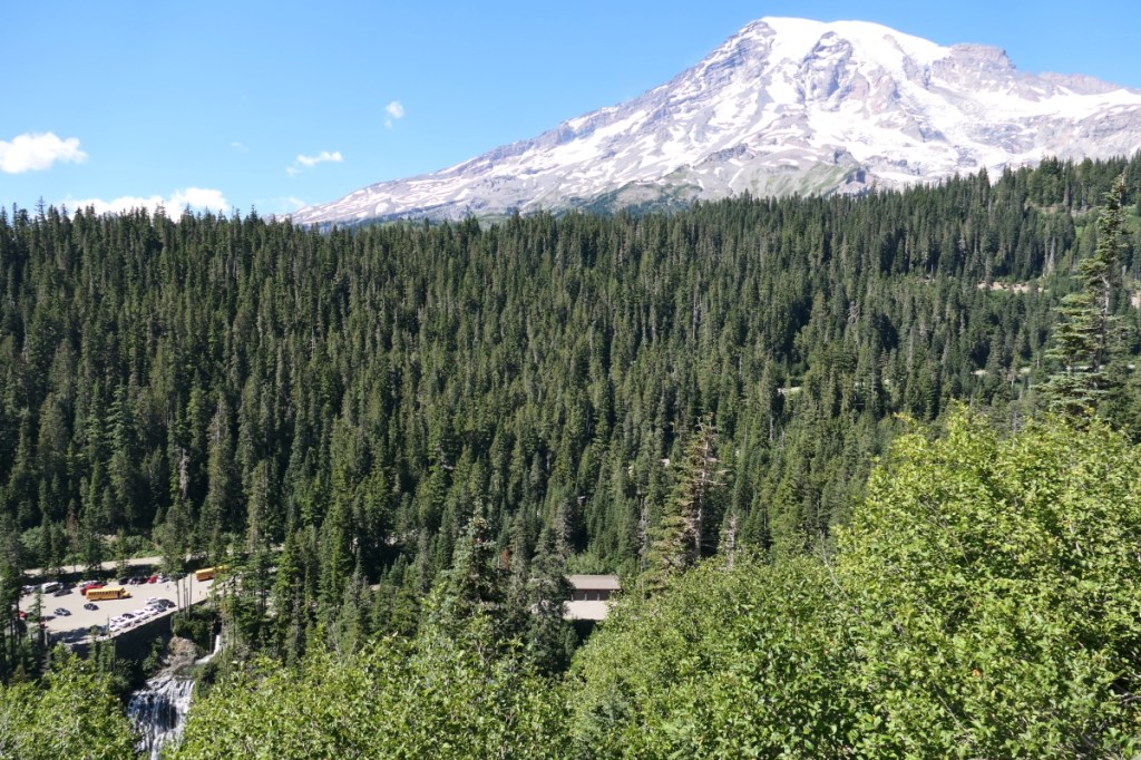 Trotz der Beschränkung der Besucher war der Parkplatz in Paradise schon überfüllt als wir dort ankamen. Aber da wir ohnehin noch nicht in unser Zimmer konnten, sind wir einfach nochmal weggefahren, und zwar Richtung Reflection Lakes. Auf dem Weg konnten wir immer wieder den Blick auf Rainier genießen und ich habe sogar einen ganz neuen Blick von oben auf Narada Falls entdeckt (auf dem zweiten Bild links unten).