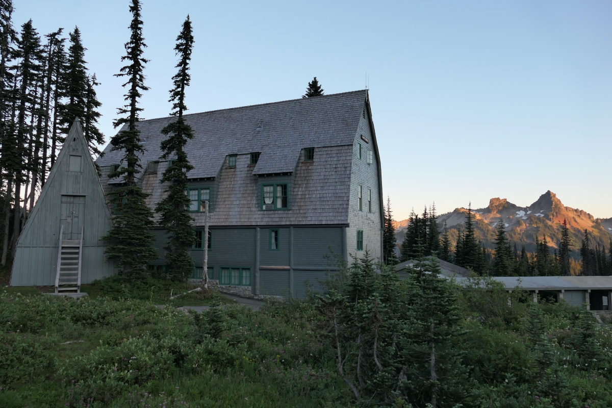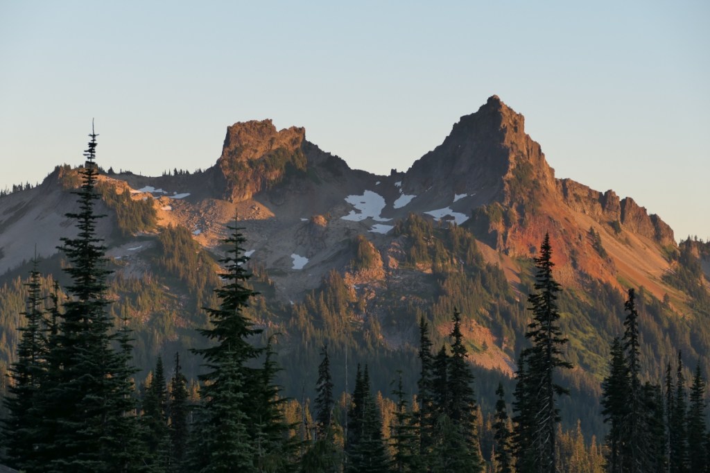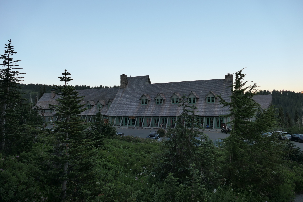 Dann ging’s ins Hotel und zum Abendessen. Danach noch ein paar Eindrücke vom Sonnenuntergang. Da Paradise sozusagen am Südhang des Mt. Rainier liegt, haben wir auf dem Berg selbst keine Abendfarben gesehen (Wolken waren ja auch keine da), dafür wurde die Tatoosh Range schön angestrahlt.