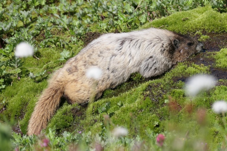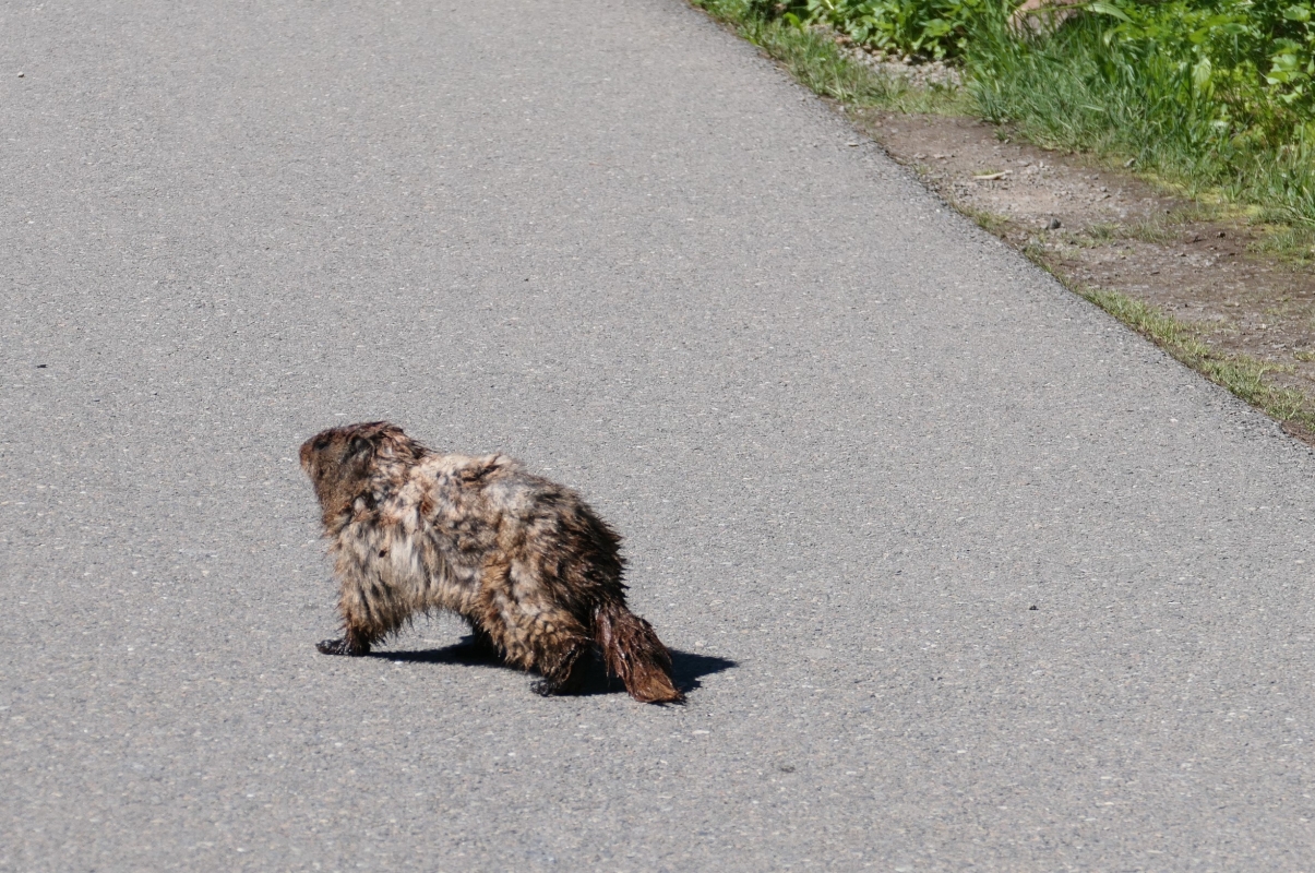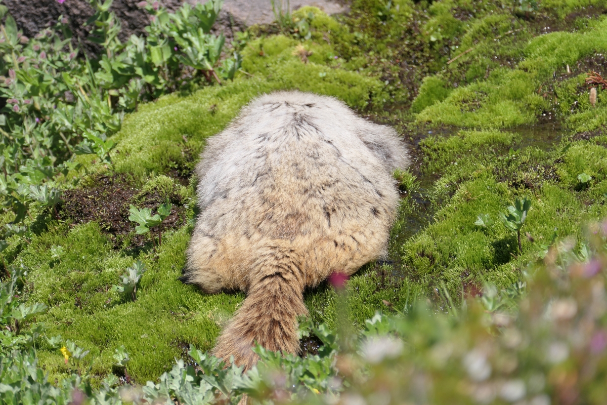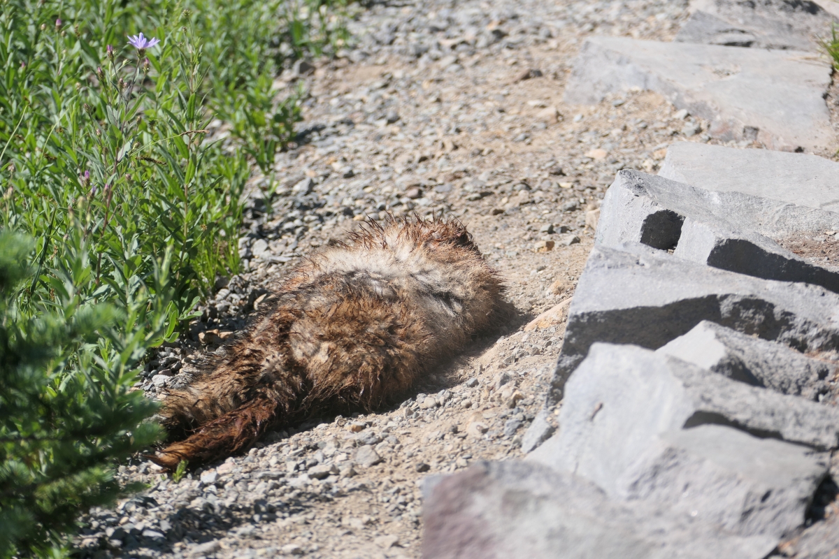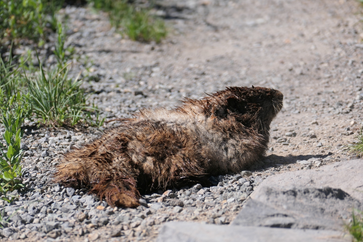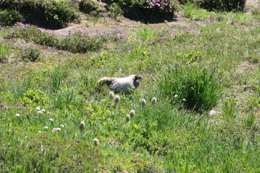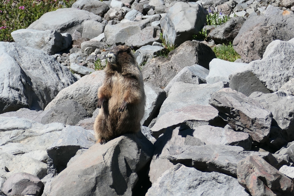 Am nächsten Tag, an dem wir ja auch schon wieder abreisten, sind wir noch den Golden Gate Trail und einen Teil des Skyline Trails gelaufen – und da ist uns doch als allererstes gleich das erste marmot (Murmeltier) entgegengekommen. Direkt auf dem Weg! ❤ Offenbar war es frisch geduscht und wollte sich dann aber zum Trocknen ins Geröll kuscheln… (Spoiler: Es sollte nicht das letzte bleiben! 🙂 )