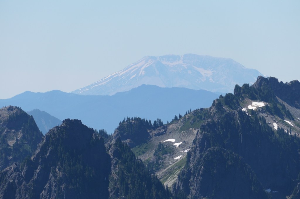 Doch auch der Blick in die andere Richtung lohnt sich. Hier sieht man z. B. Mount St. Helens.