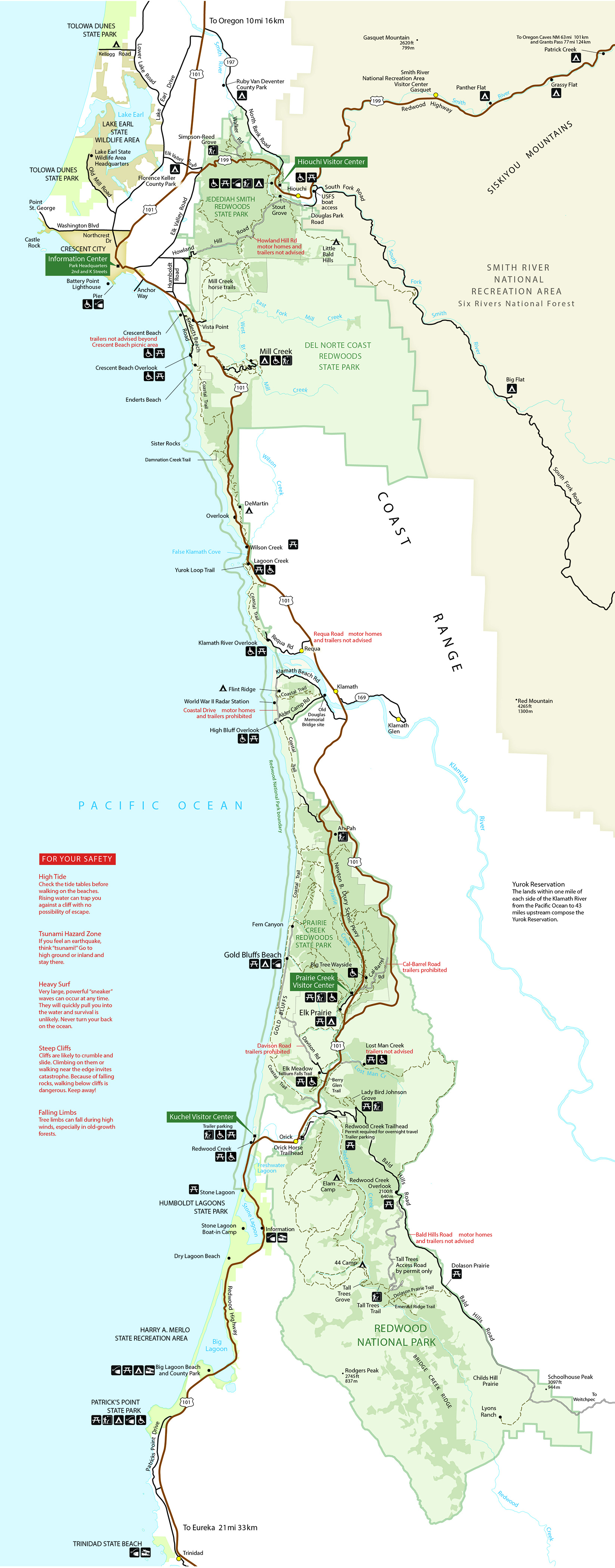 Das Coole an den Redwoods ist ja, dass wir tatsächlich drei Tage diese Giganten bewundern konnten, weil es neben den ohnehin schon lang gezogenen Redwood National Park und State Parks, die auf der folgenden Karte zu sehen sind, weiter im Süden (südlich von Eureka) dann auch noch den Humboldt Redwoods State Park gibt. Es waren drei Tage voller Staunen… 😮 ❤ Ich fasse die drei Tage zusammen, auch wenn dazwischen noch Eureka lag, wo ich auch einige Fotos gemacht habe.