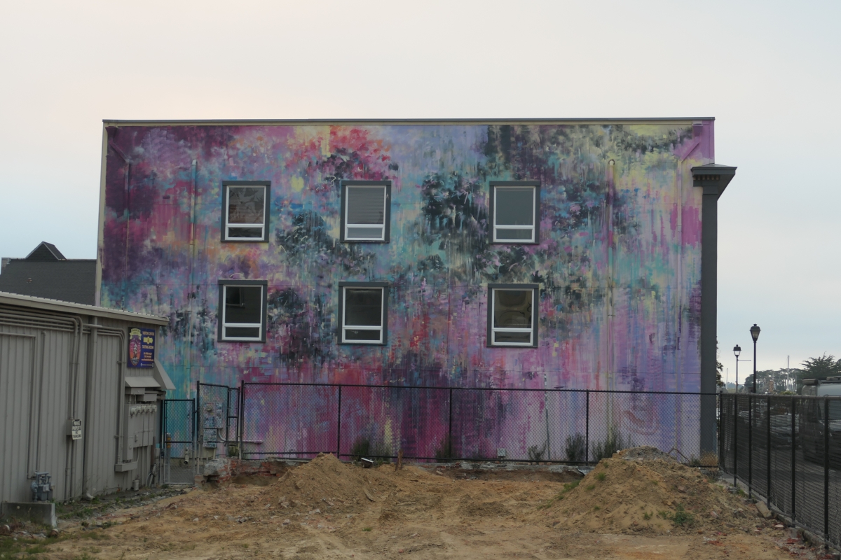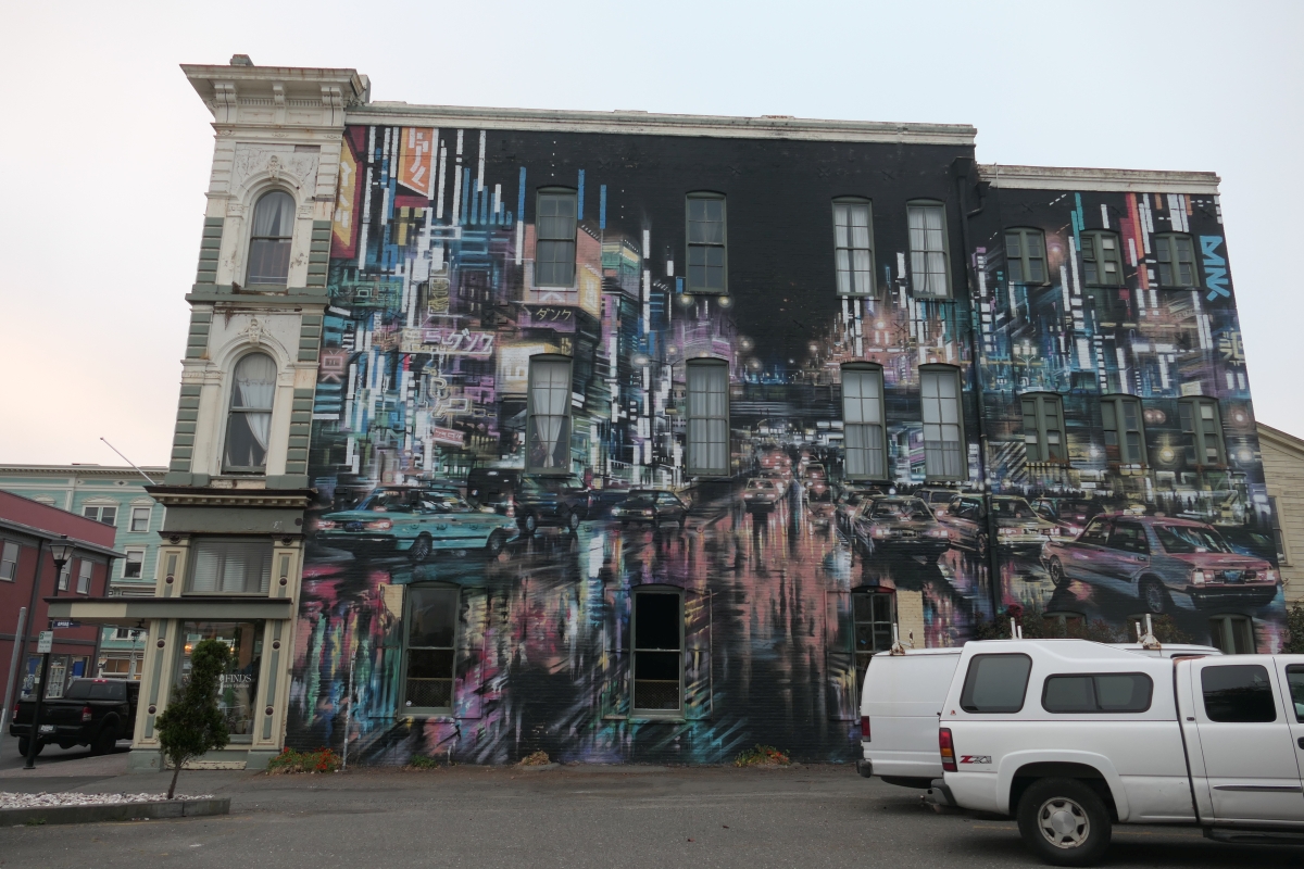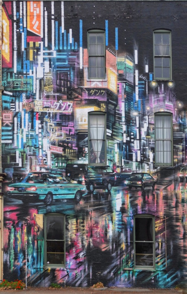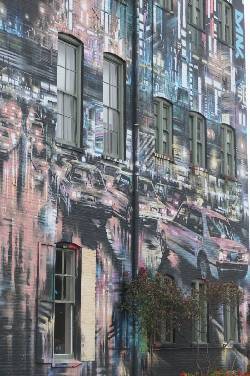Das große mural (Wandgemälde) oben – mit den Ausschnitten oben rechts und hier drunter – heißt ‚Electric City‘ und ist von Dan Kitchener. Leider mussten mal wieder weiße Lieferwagen davor stehen.