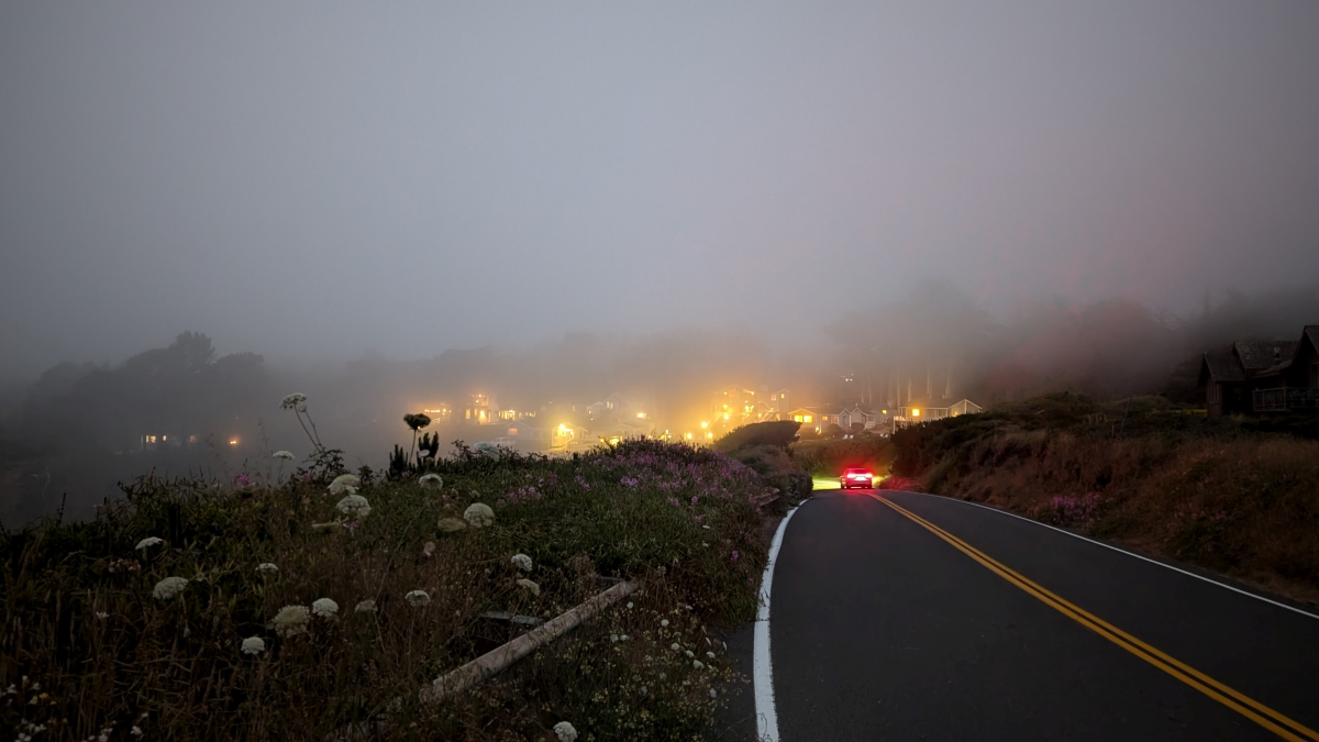 Dann ging es im Dunkeln zurück – wir waren mal wieder die einzigen, die zu Fuß die Straße (natürlich ohne Fußweg) entlang gelaufen sind. Es war übrigens deutlich dunkler als auf diesen Bildern, die ich im Nachmodus meines Google Pixel 8 aufgenommen habe.