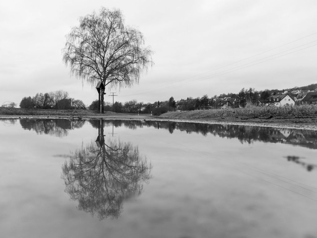Ich bin für drei Nächte in meiner oberfränkischen Heimat auf Besuch bei meiner Mutter. Da war es heute Grau in Grau. Aber zumindest gab’s eine schöne große Pfütze an passender Stelle…