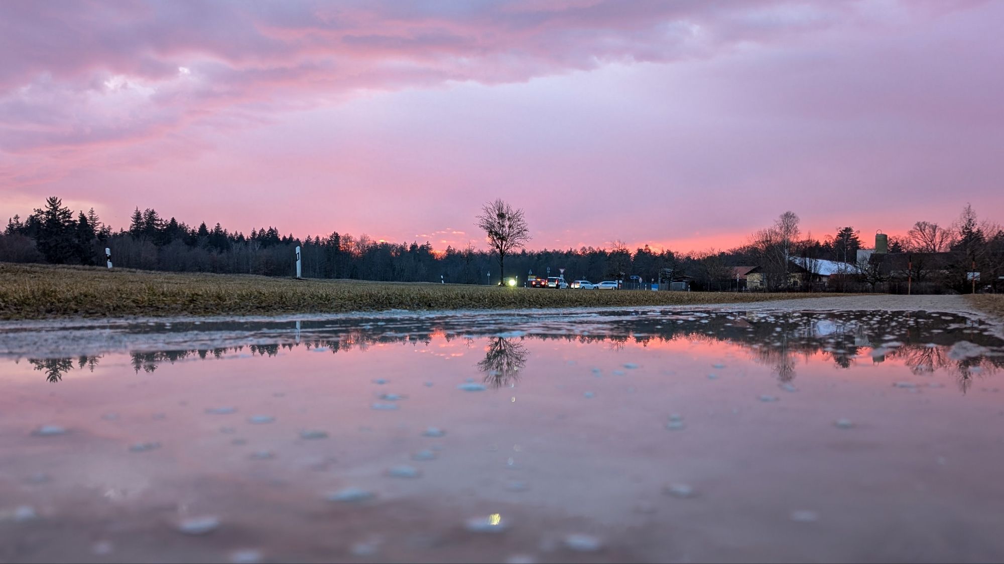 Bei uns ist es heute Grau in Grau. Pfützen sind aber auch alle weg. Deswegen ein Foto von Anfang Februar mit Sonnenuntergang.