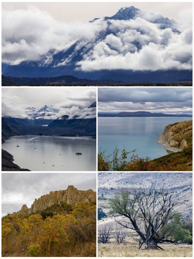 Oben Mt. Tasman (?); links drunter Tasman Glacier Lake, im Hintergrund evtl Aoraki / Mount Cook; rechts daneben Lake Pukaki; links unten Clay Cliffs Omarama; ein sehr alter Ent 🙂 an der Strecke zu den Clay Cliffs.
